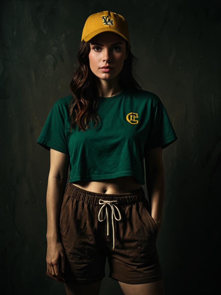 Woman, casual sporty, cropped grey t-shirt, relaxed fit, short sleeves, green drawstring shorts, relaxed fit, side pockets, yellow baseball cap with purple logo, plain white background --sref 1406