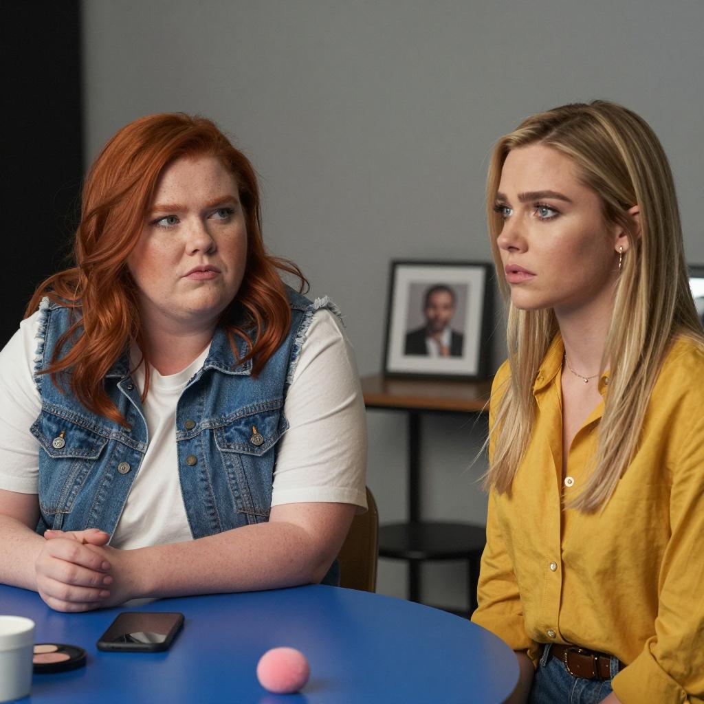 Photograph of two women under blue and orange lighting. Woman on left has dark curly hair, brown skin, black top, white cardigan with orange heart. Woman on right has long blonde hair, pale skin, brown shirt, brown cardigan. Both look downward. Clock on wall in background. Medical monitor on right. Window with blinds on left.
