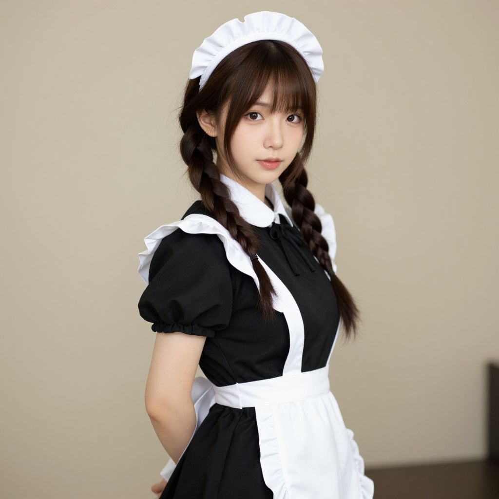 Photograph of an Asian woman with long black hair, wearing a brown and white maid outfit with cat ears. The dress has short brown sleeves, a white ruffled apron, and a brown skirt with white trim. She holds the skirt out to the sides, revealing its fullness. The woman has fair skin and a neutral expression. The background is a plain, light beige color. The cat ears are black with a slight sheen, adding a playful touch to her ensemble. The image has a slightly soft focus and subtle digital enhancement.