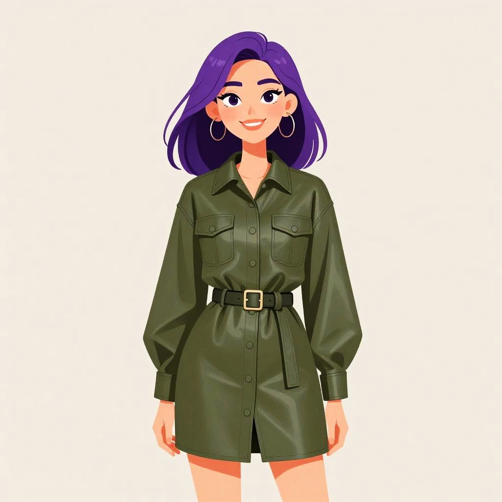 Digital illustration of a smiling young woman with straight, vibrant purple hair. She wears a dark green, long-sleeved, button-up dress with two chest pockets, a belt with a silver buckle, and large hoop earrings. Her skin is fair, and her eyes are large and expressive. The background is plain white, making her the central focus. The dress has a slight sheen, suggesting a leather or faux-leather texture. The overall style is cartoonish with bold colors and clean lines.