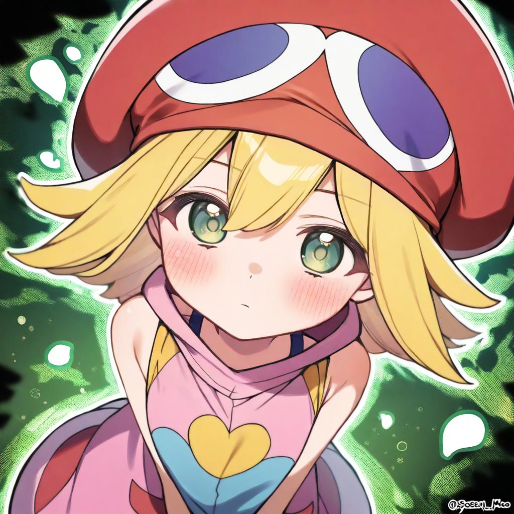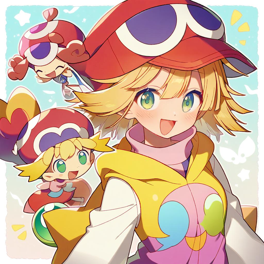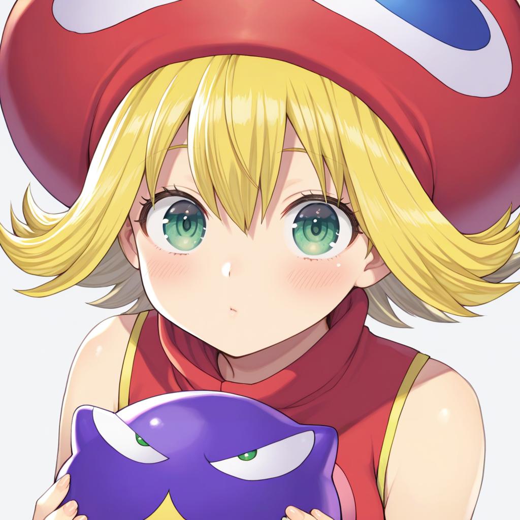 Amitie (puyopuyo), puyopuyo, 1girl, green eyes, blonde hair, short hair, hat, red headwear, by artist mamiyama, leet