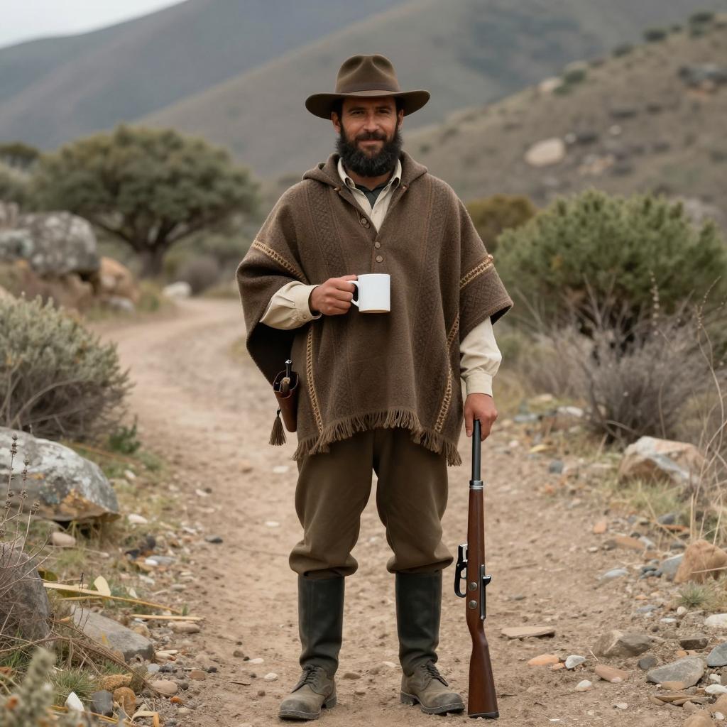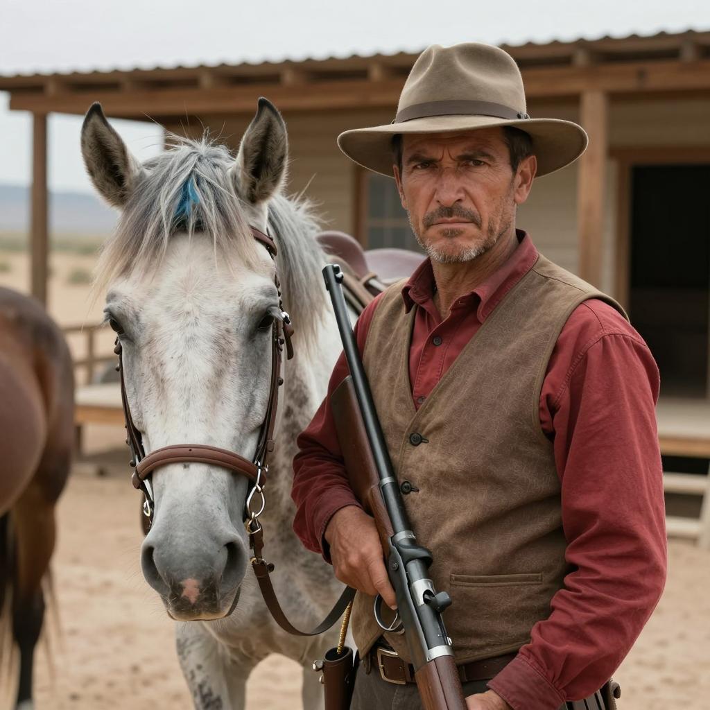 Photograph of a bearded man with a brown hat, wearing a brown patterned poncho, sitting on the ground, holding a rifle. He has a focused expression, looking to the right. Background includes a plain, stone building with a single door. Sunlit, desert-like setting. Man's left hand rests on his knee, right hand grips the rifle.