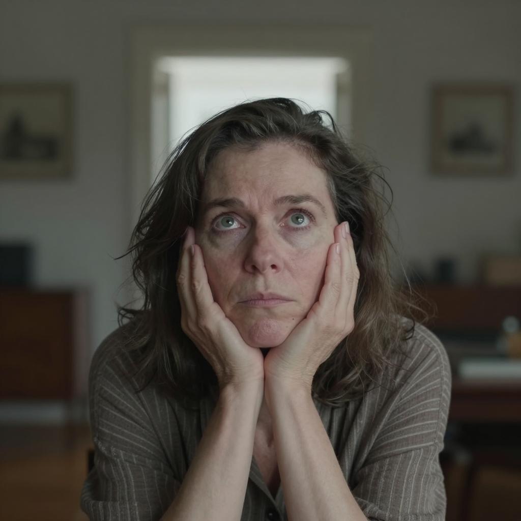 Middle-aged woman with pale skin and dark, slightly messy hair, looking up with a neutral expression. She rests her hands under her chin. She wears a striped brown shirt. Background is a dimly lit indoor space with a bright doorway in the center. Blurred dark wooden furniture is visible.