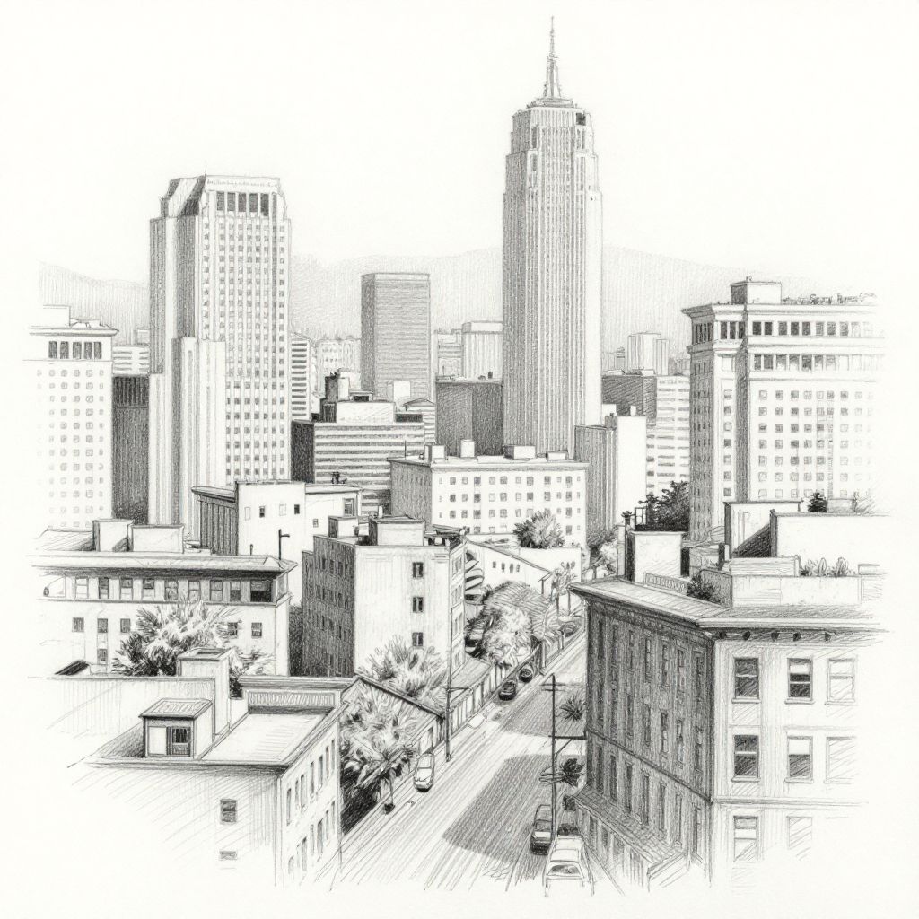 Turn photos into sketches of urban cityscapes with intricate pencil lines and soft shading, capturing the raw textures and architectural details in monochrome, blending realism with artistic interpretation.