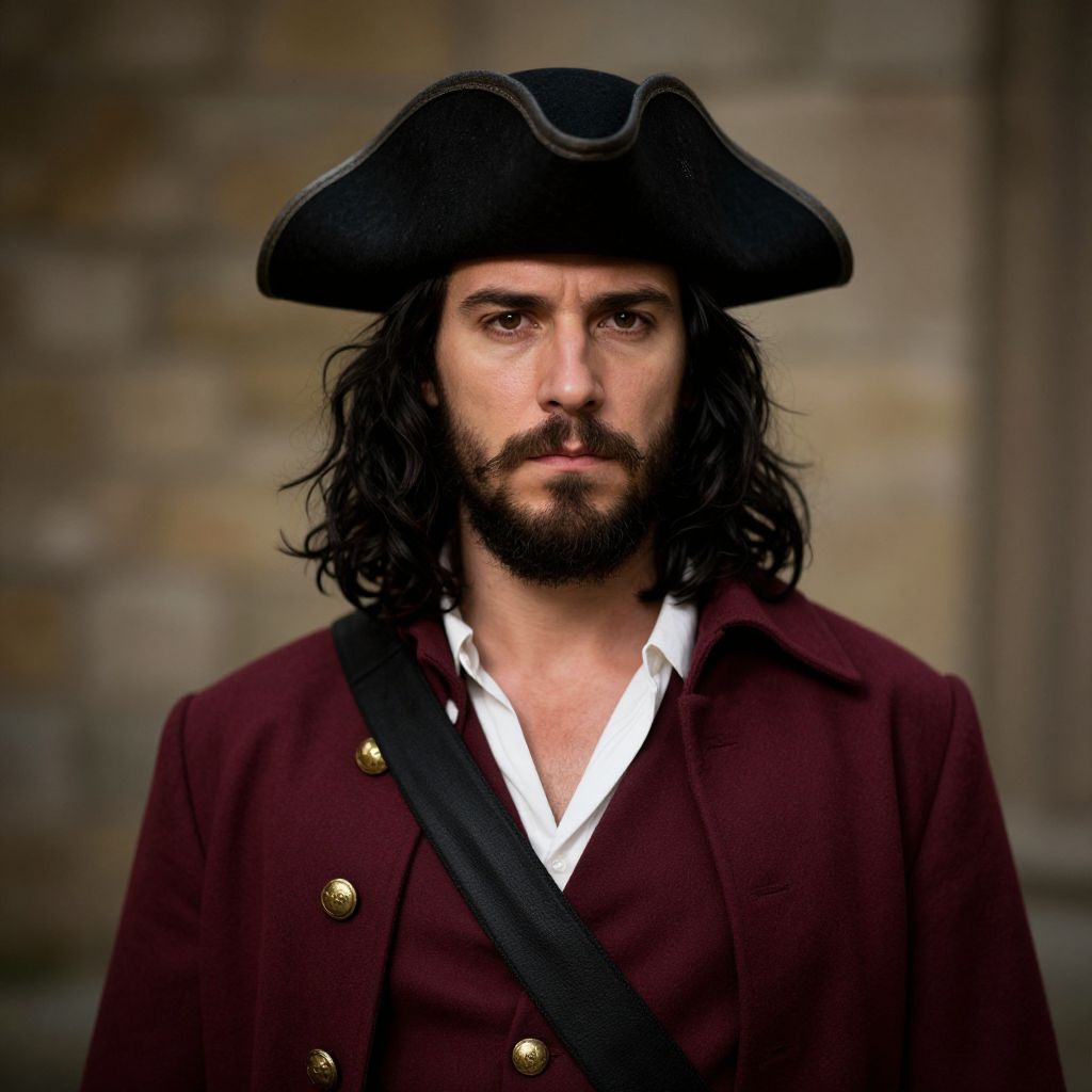 A photograph of a bearded man with dark hair and a serious expression, dressed as a pirate. He wears a black tricorn hat with white stitching, a maroon coat with gold buttons, and a white shirt with a black strap crossing his chest. The background is a blurred stone wall, giving a historical, pirate-themed vibe. The lighting highlights his face and hat, adding dramatic contrast.