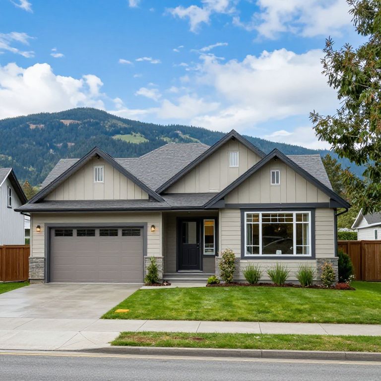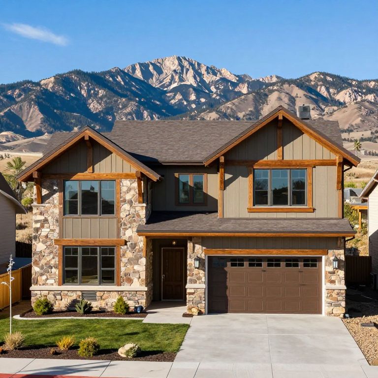 Spectacular single-family home showcasing a charming blend of rustic and modern design, featuring a stone facade, wooden accents, and a spacious garage, set against breathtaking mountain views at 6314 N Whispering Way, Heber City, Utah 84032, United States.