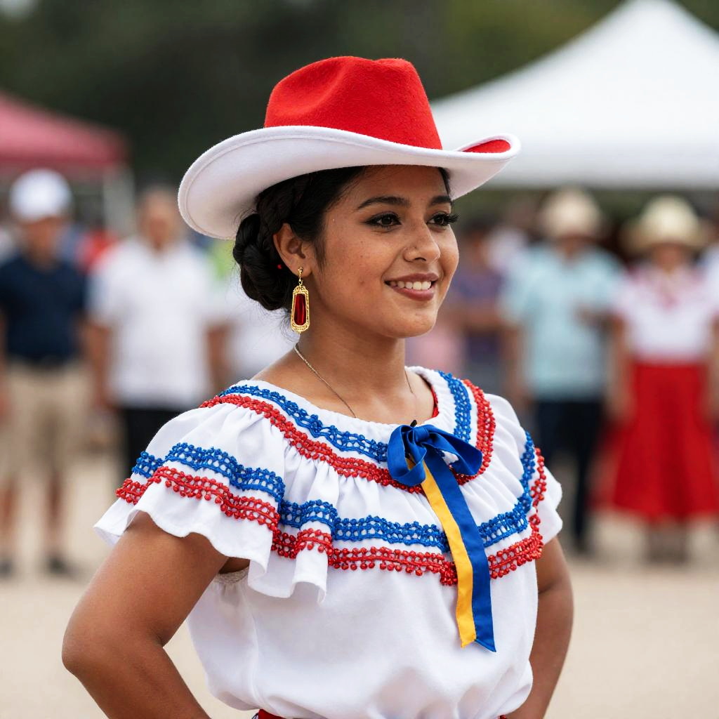 National Costume Usa, woman in traditional dress with a red and white hat