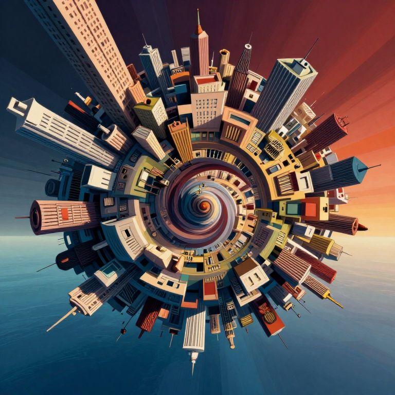 Digital illustration of a colorful planet with a city skyline, surrounded by floating balloons, rings, and water, set against a white background.
