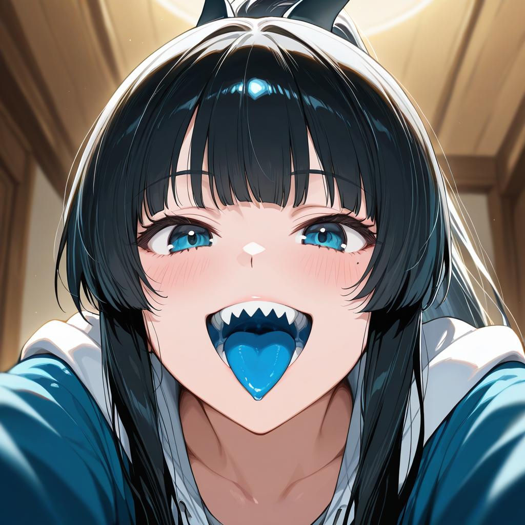 Artemis of the blue, atelier live, 1girl, shark girl, sharp teeth, blue tongue, black eyes, mole under eye, black hair, long hair, ponytail, blunt bangs, virtual youtuber, virtual youtuber, shark fin, by artist vihua6, illustrious
