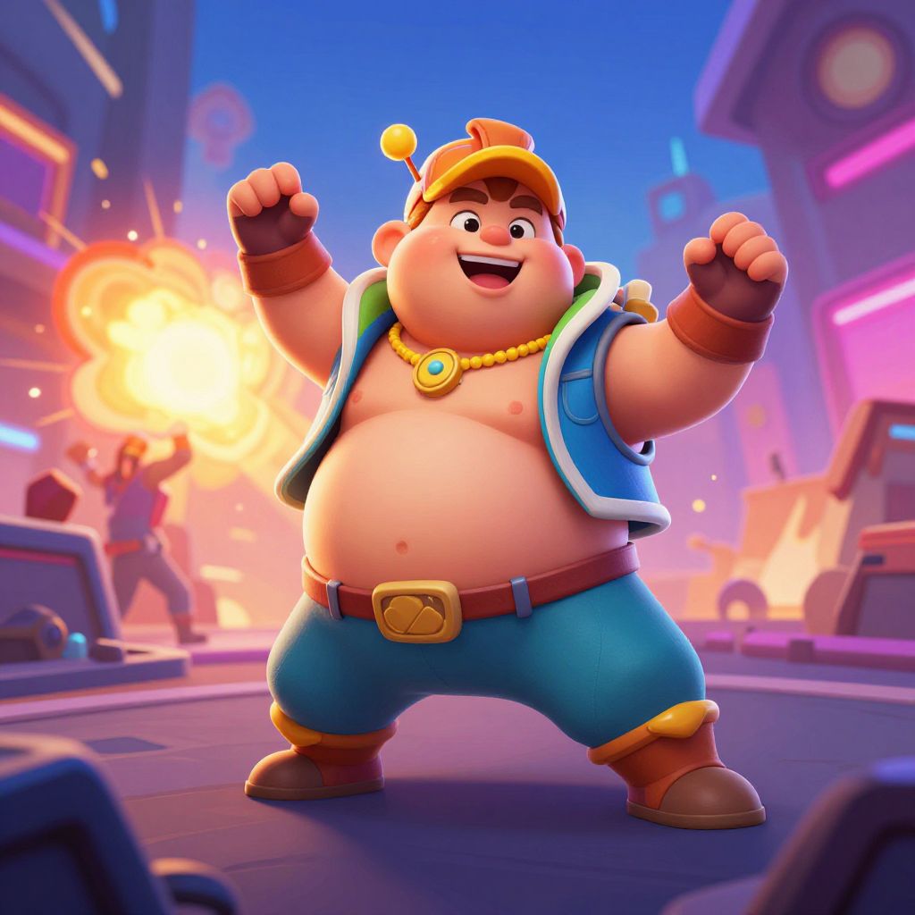 Fat skin Fortnite avatar, playful and chubby body type, bright and quirky costume, energetic action scene with explosions, neon-lit urban battlefield, stylized illustration, upbeat and lively mood, digital painting with rich textures.