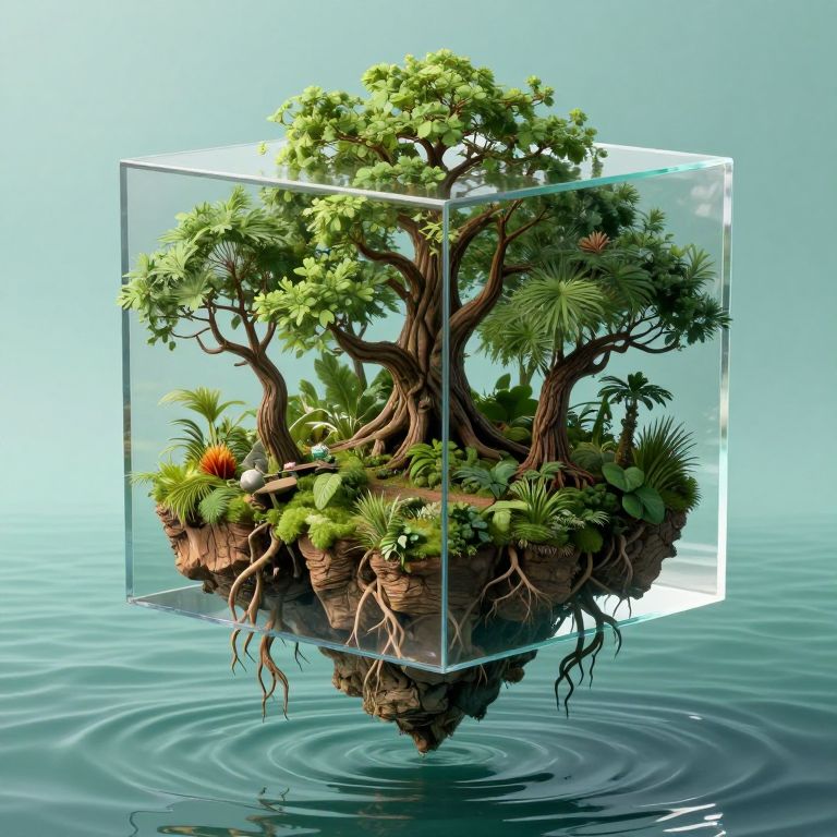 CGI image of a floating, root-anchored, multi-tree island with diverse greenery inside a transparent cube, set on calm water.