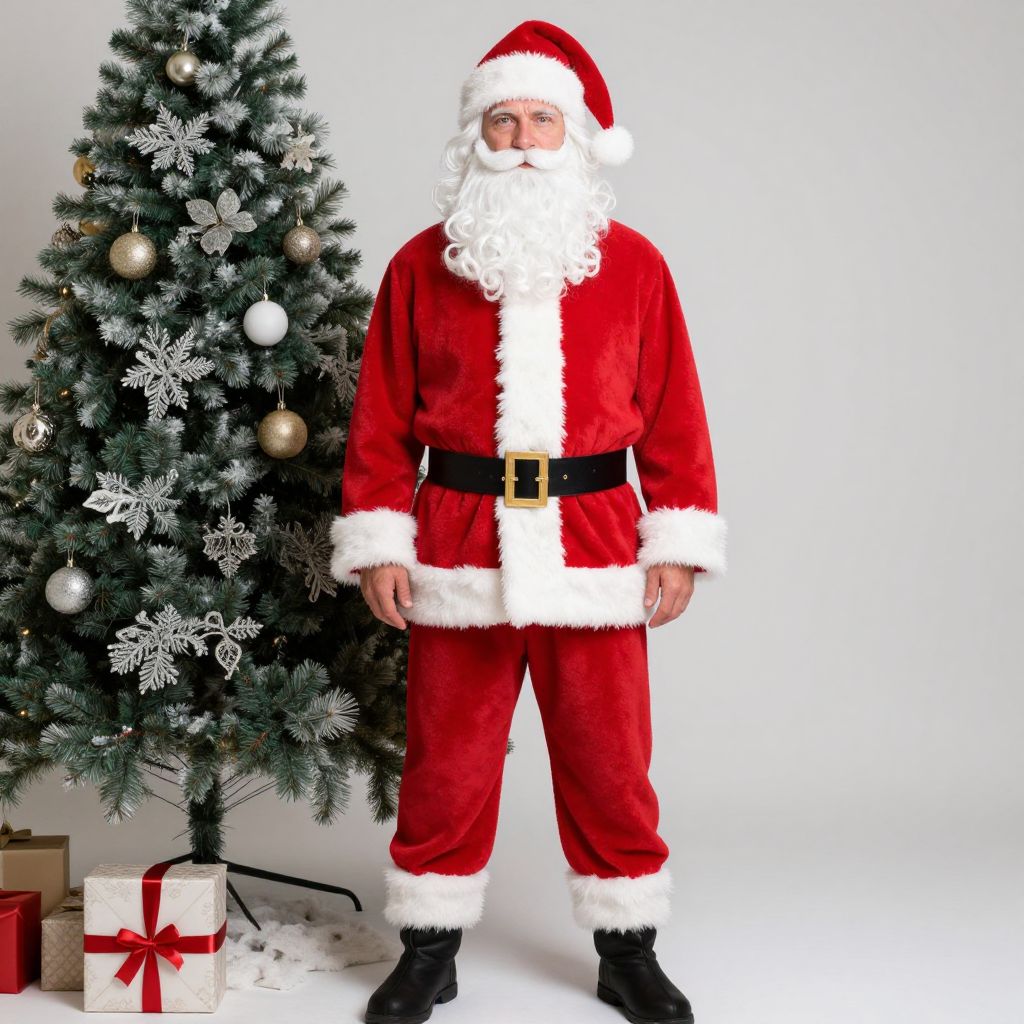 Classic Christmas Outfit Costume, dressed in a santa suit standing in front of a christmas tree