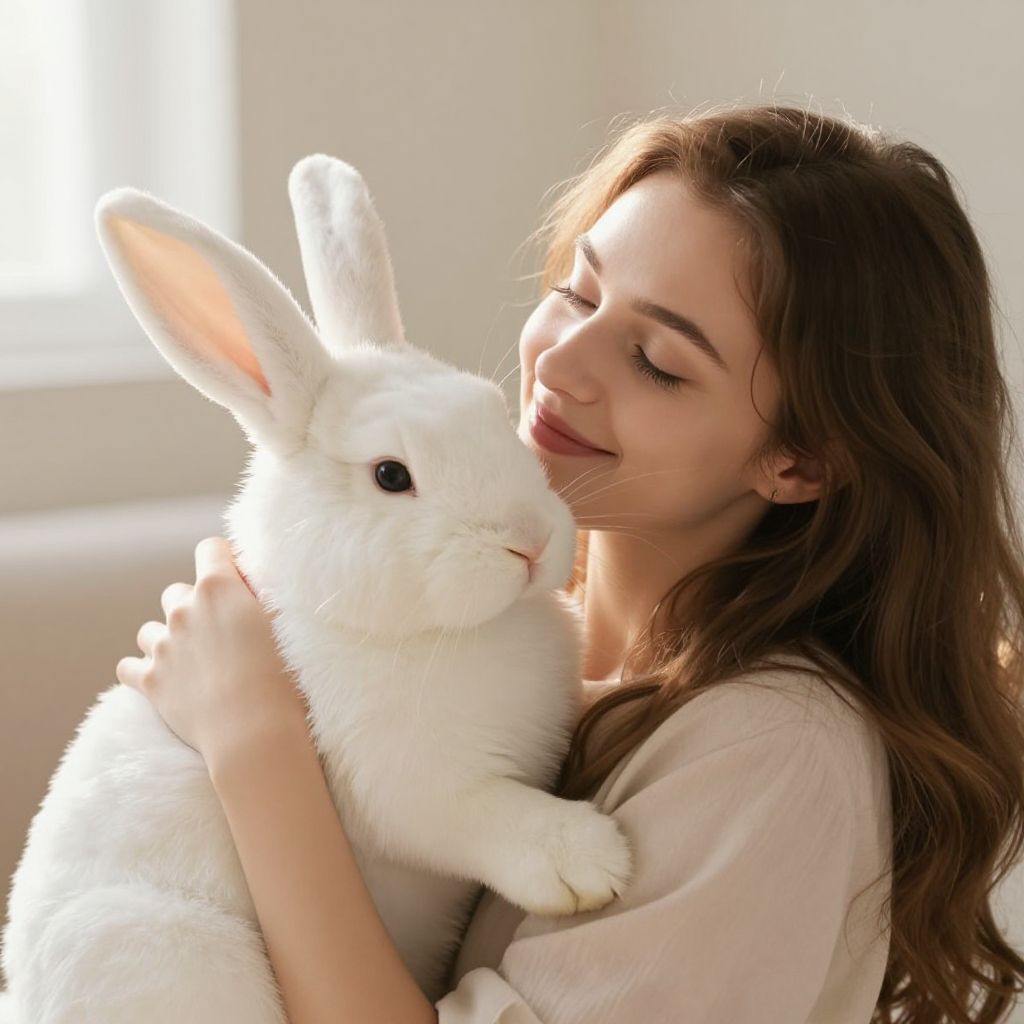 Radiant joy and timeless innocence converge as a woman embraces a plush white rabbit, their shared warmth and gentle presence evoking a sense of pure, unspoken connection.