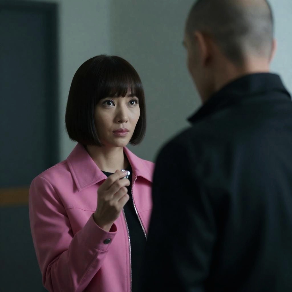 Photograph of a woman with a short black bob haircut, wearing a bright pink jacket, holding a small, shiny object in her hand. She has intense, focused eyes. A bald man with a high-collared black jacket is facing her, partially silhouetted. Background is dimly lit with green and blue hues. The man's back is to the camera.
