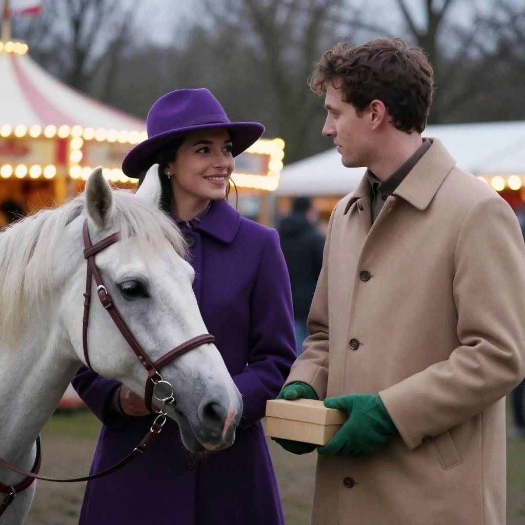 Photograph of two people at a carnival carousel. Man on left, dark blue jacket, brown hair, looking down at horse. Woman on right, white coat, beige hat, looking at horse. Ornate white horse with purple and blue decorations, red roses, gold accents. Carousel with colorful lights and patterns in background. Horse in mid-gallop. Both people have neutral expressions. Wooden floor. Man on left, woman on right, carousel in center.