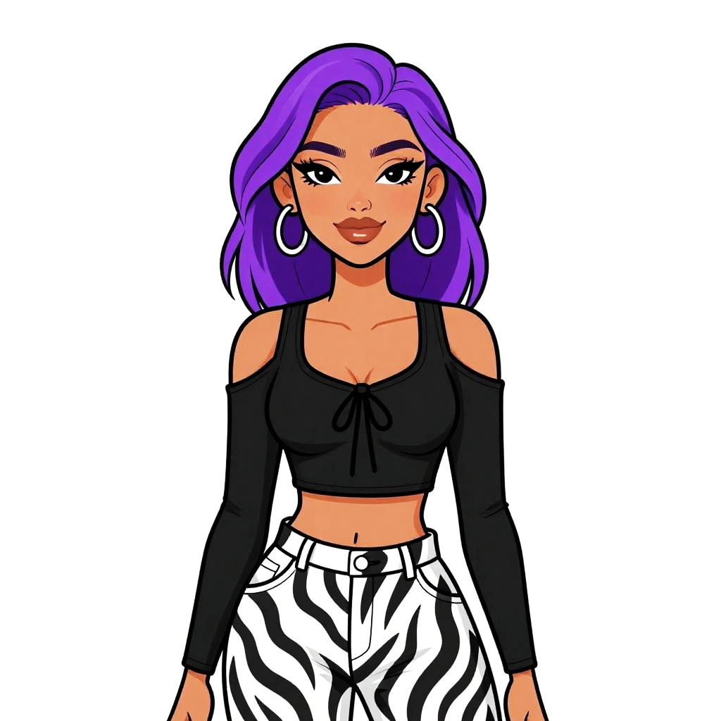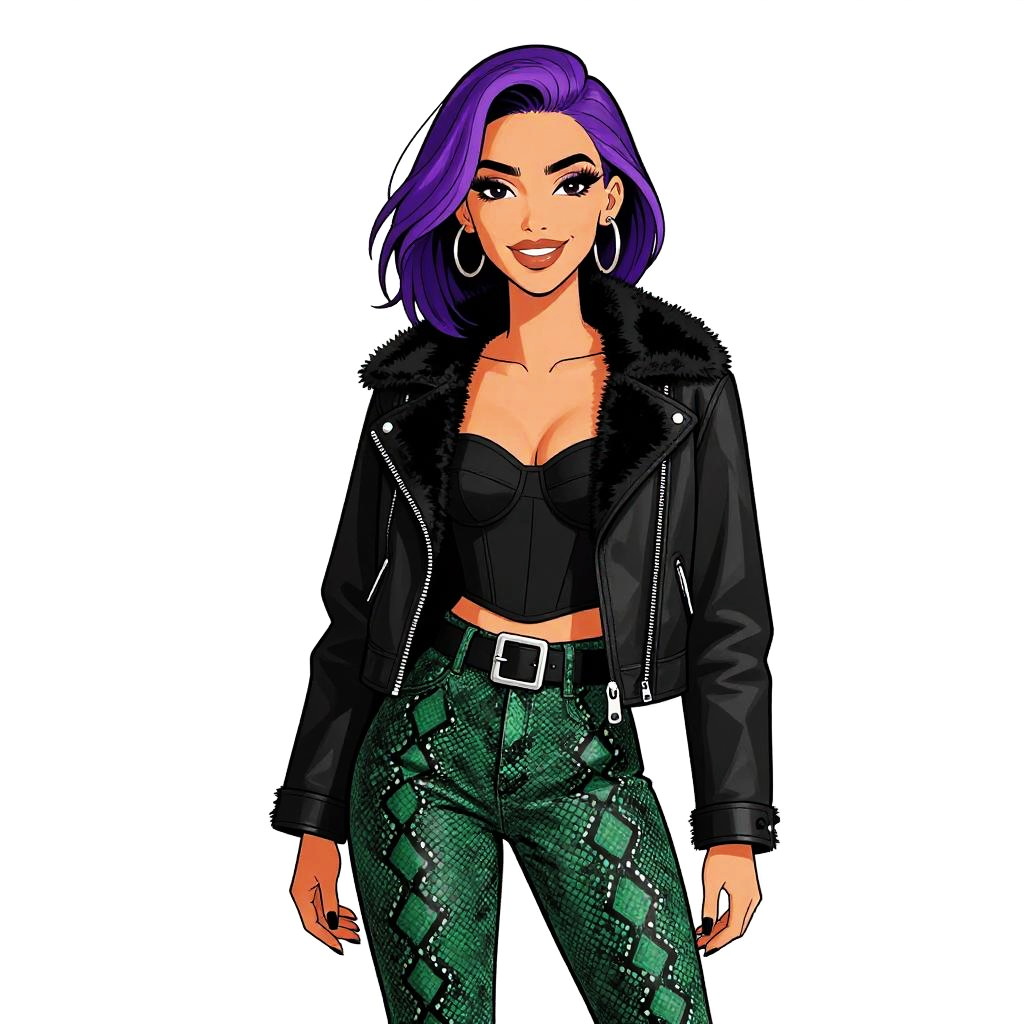 Woman with pretty face and pretty hair. Woman, urban chic, black ribbed knit top with a deep plunging neckline and silver zipper detail, long sleeves, paired with high-waisted plaid trousers in black, gray, and white, tapered fit, chain accessory attached to belt loops, plain white studio background. --sref 1467