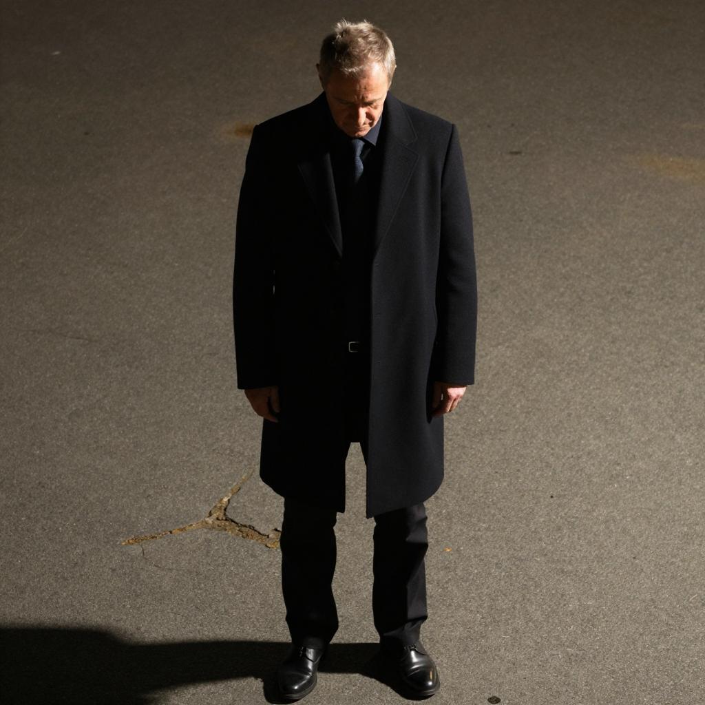 Male with white hair in dark overcoat, striped tie, and dark pants stands on a lit sidewalk at night. Hands in pockets, head slightly bowed. Background is dark with strong light from left. Monochromatic, sepia-toned.