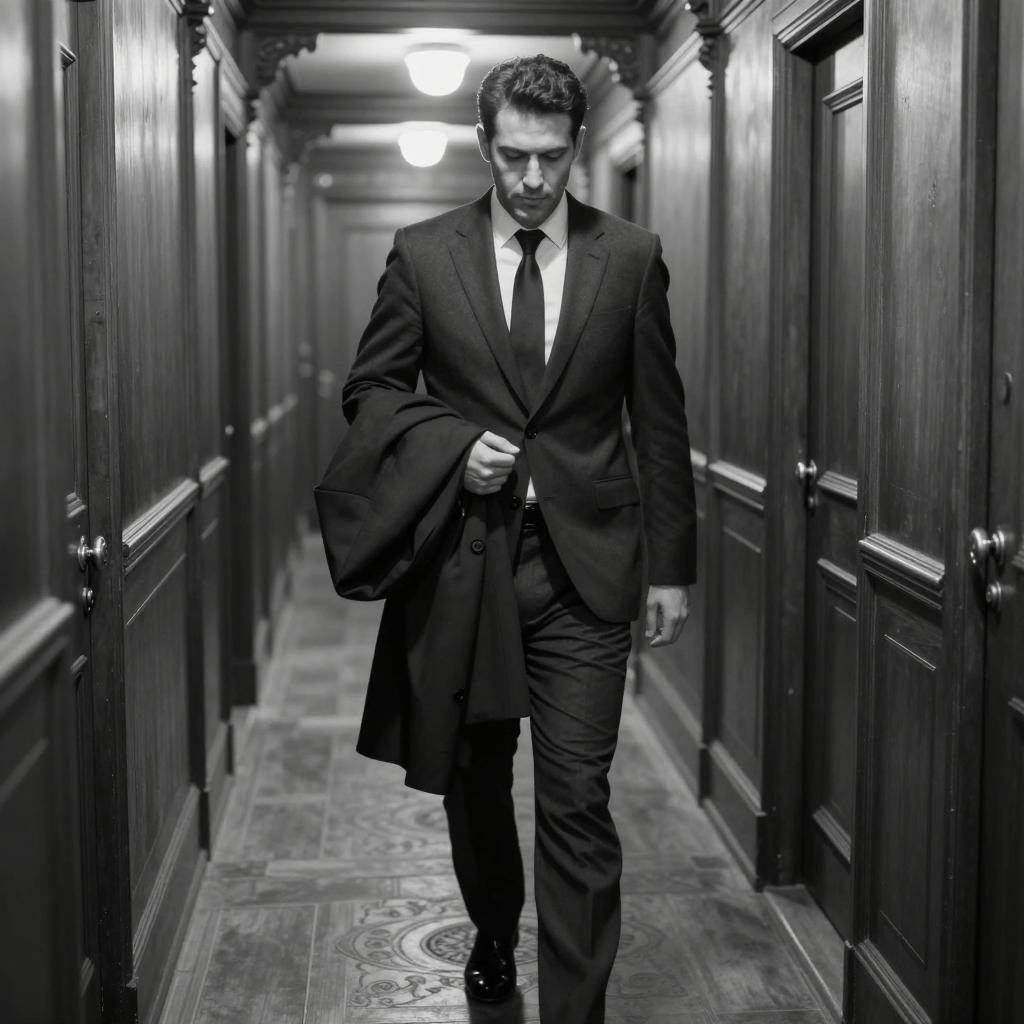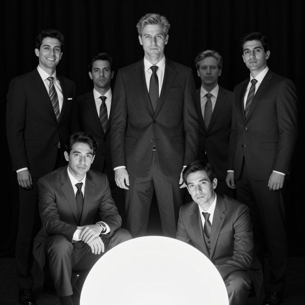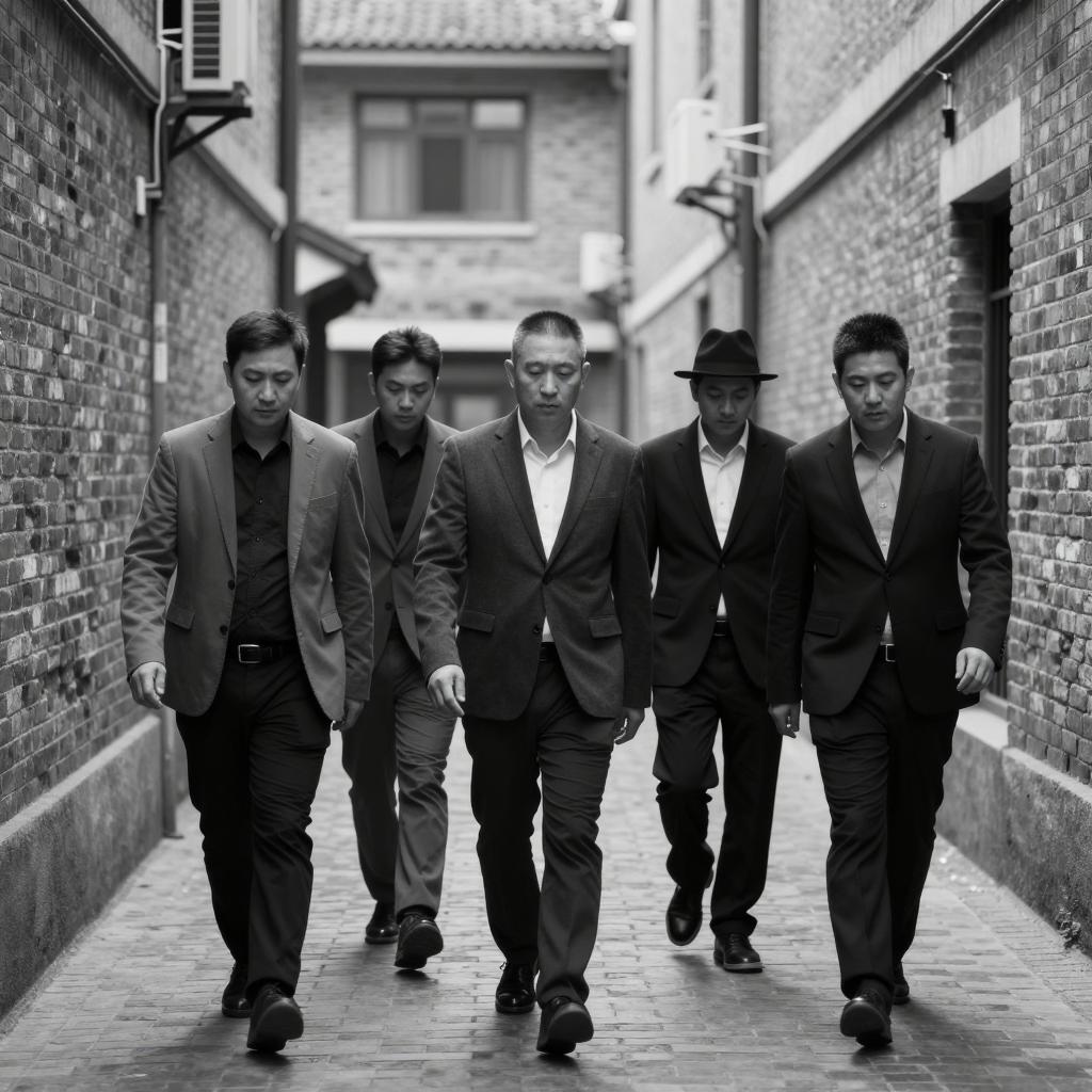 Black and white photo of four men walking down a narrow, brick alleyway. All wear dark suits, ties, and dress shoes. One man in the center leads, holding a cigarette in his right hand. Two men on the left and one on the right walk beside him. Alley has brick walls on both sides, with a small building and chimneys in the background. The ground is wet with puddles.