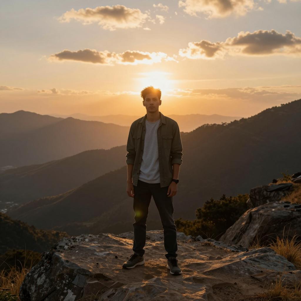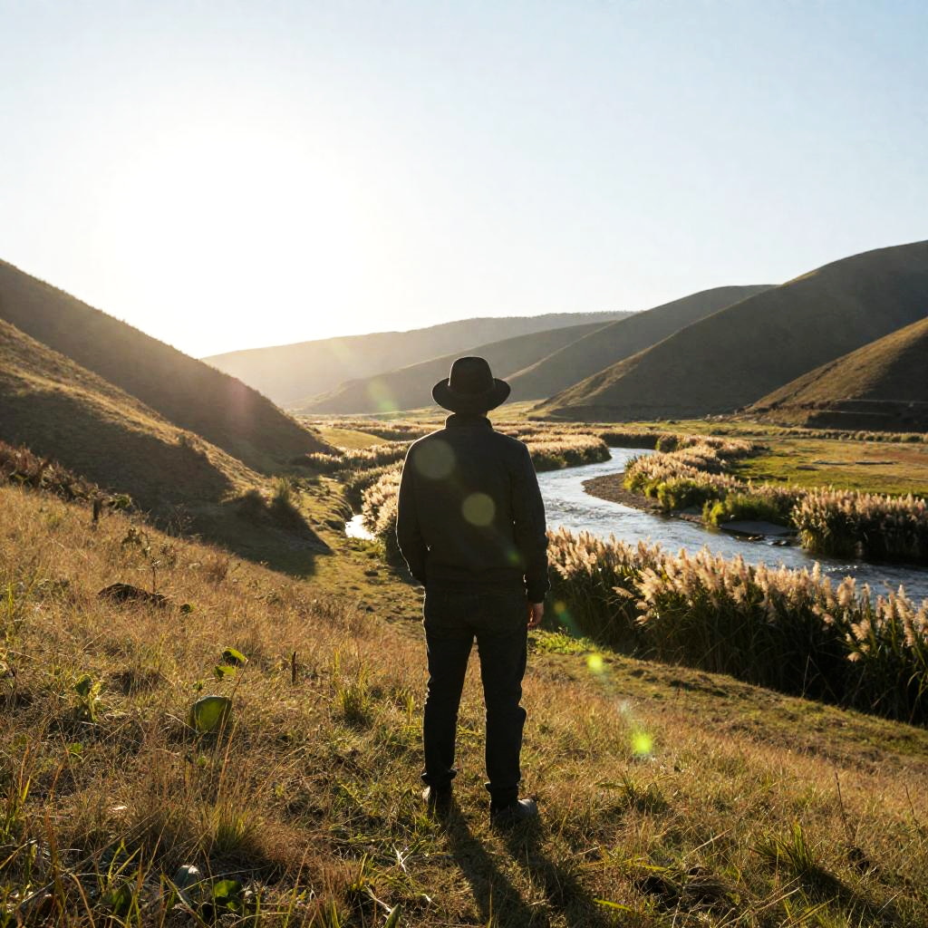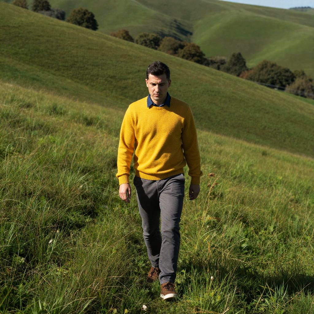 Photograph of a man walking up a grassy hill in a mountainous, forested area. He has short hair, wears a yellow long-sleeve shirt and gray pants. Sunlight casts shadows on the green and brown hills. Background includes dense trees and distant hills. Man is centered, looking forward.
