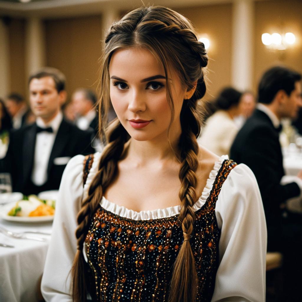 Portrait of a young woman with long braided brown hair wearing a traditional beaded dress with puffed white sleeves at an indoor banquet. The background is blurred with formally dressed people seated at tables, emphasizing a formal event setting.