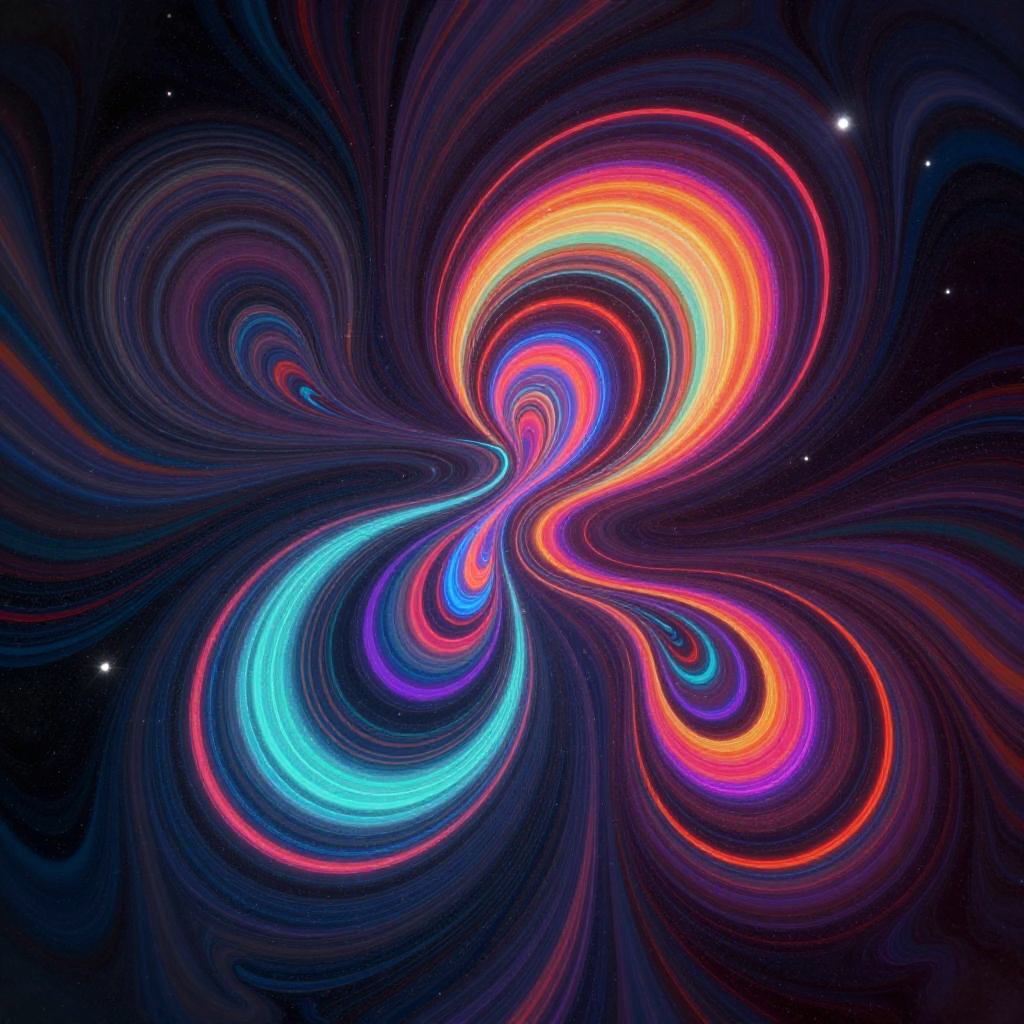 Digital abstract art featuring vibrant, swirling neon colors (orange, blue, pink, purple) forming a dynamic, butterfly-like pattern against a dark, star