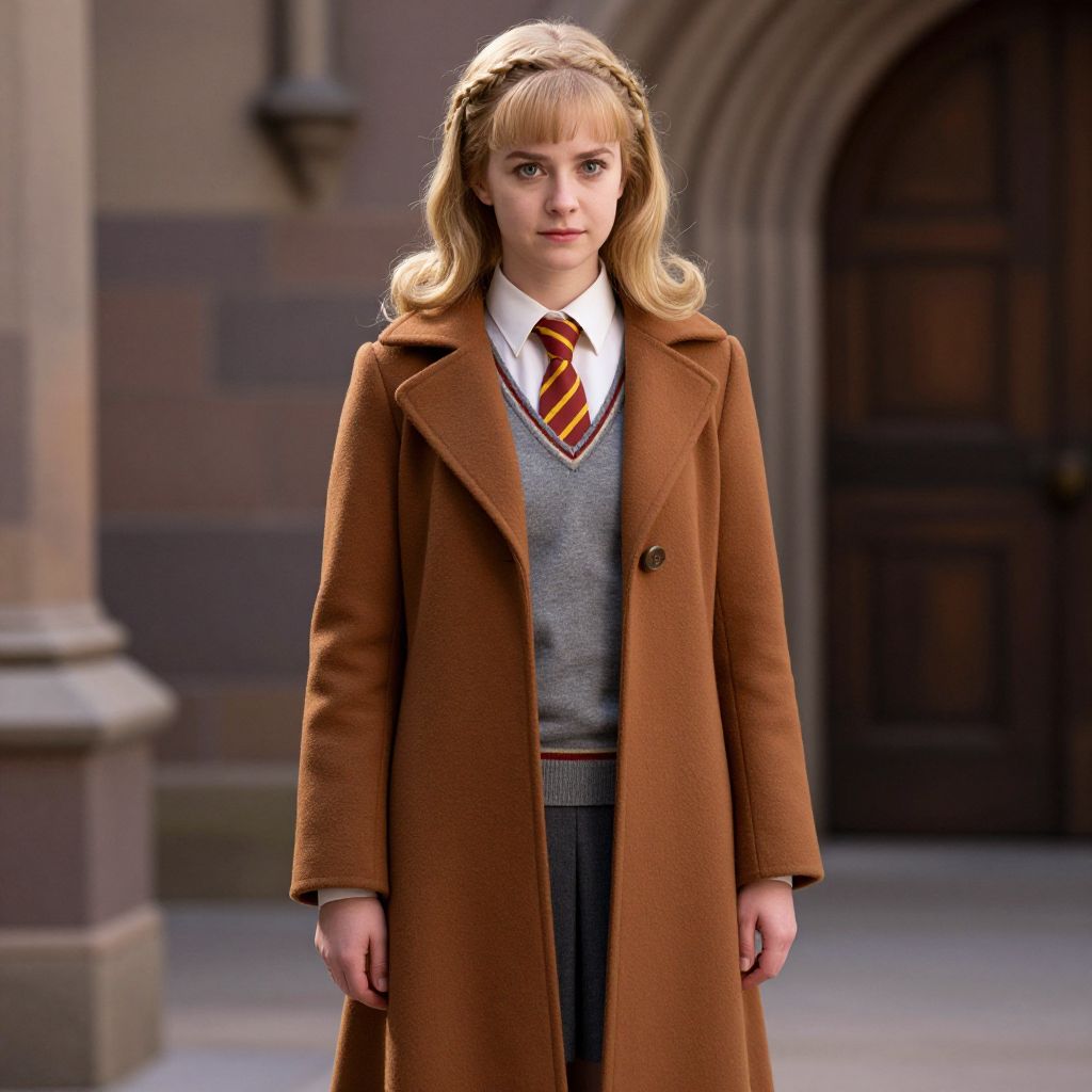 Photograph of a young blonde girl in a Hogwarts-style uniform, including brown coat, grey sweater, white shirt, and striped tie, standing in front