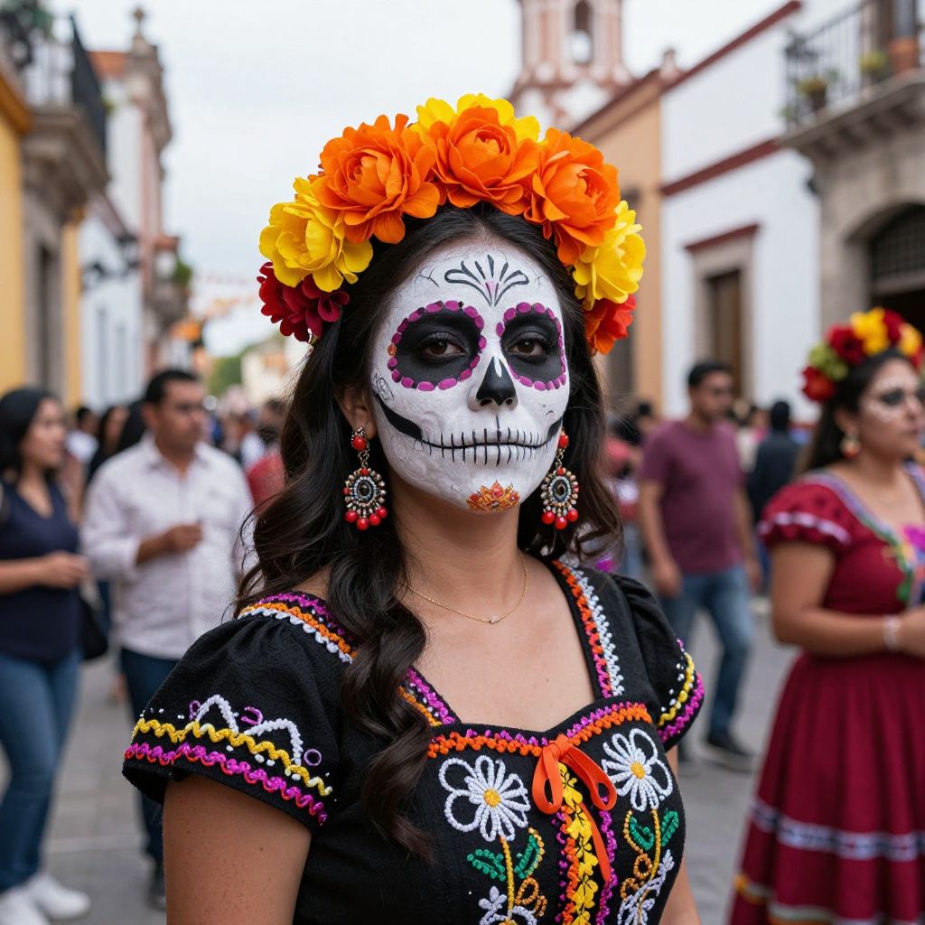 Vibrant Day of the Dead celebration in Jalisco, Mexico, featuring a woman adorned with intricate sugar skull makeup, a radiant orange and yellow floral crown, and traditional attire, surrounded by festive participants in a bustling street scene.