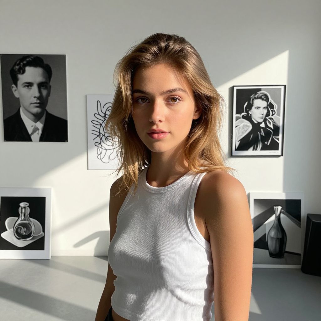 A realistic photography of a young woman with warm brown eyes and soft blonde hair standing in a sunlit studio, surrounded by black and white artwork including vintage portraits, abstract lines, and still-life objects, with natural light casting sharp contrasts on the walls and floor.