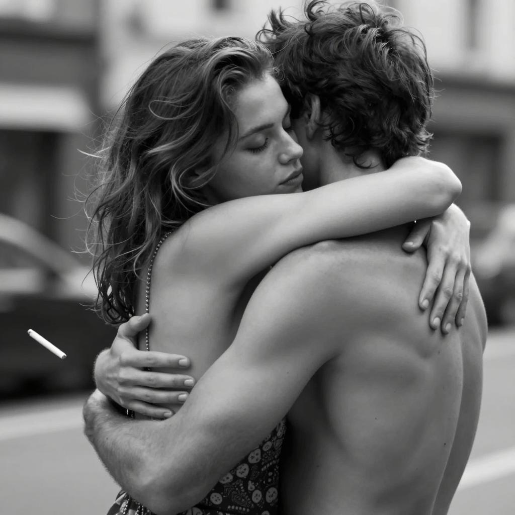 Black and white photograph capturing a close, intimate hug between a topless man and woman. The woman has wavy hair, eyes closed, and holds a cigarette in her right hand. The man has messy hair and a muscular back. Their arms are wrapped tightly around each other in an intense, emotional embrace with a blurred urban background.