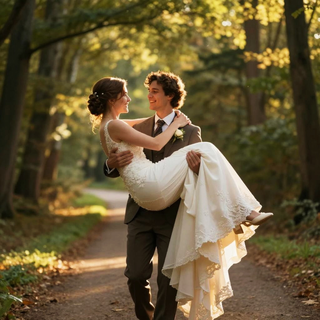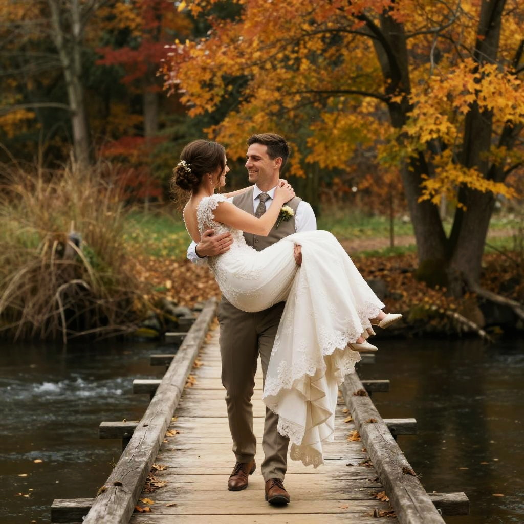 Man carrying woman bridal style across a rustic wooden bridge over a serene river, vibrant autumn colors, warm and intimate moment, high detail, realistic style
