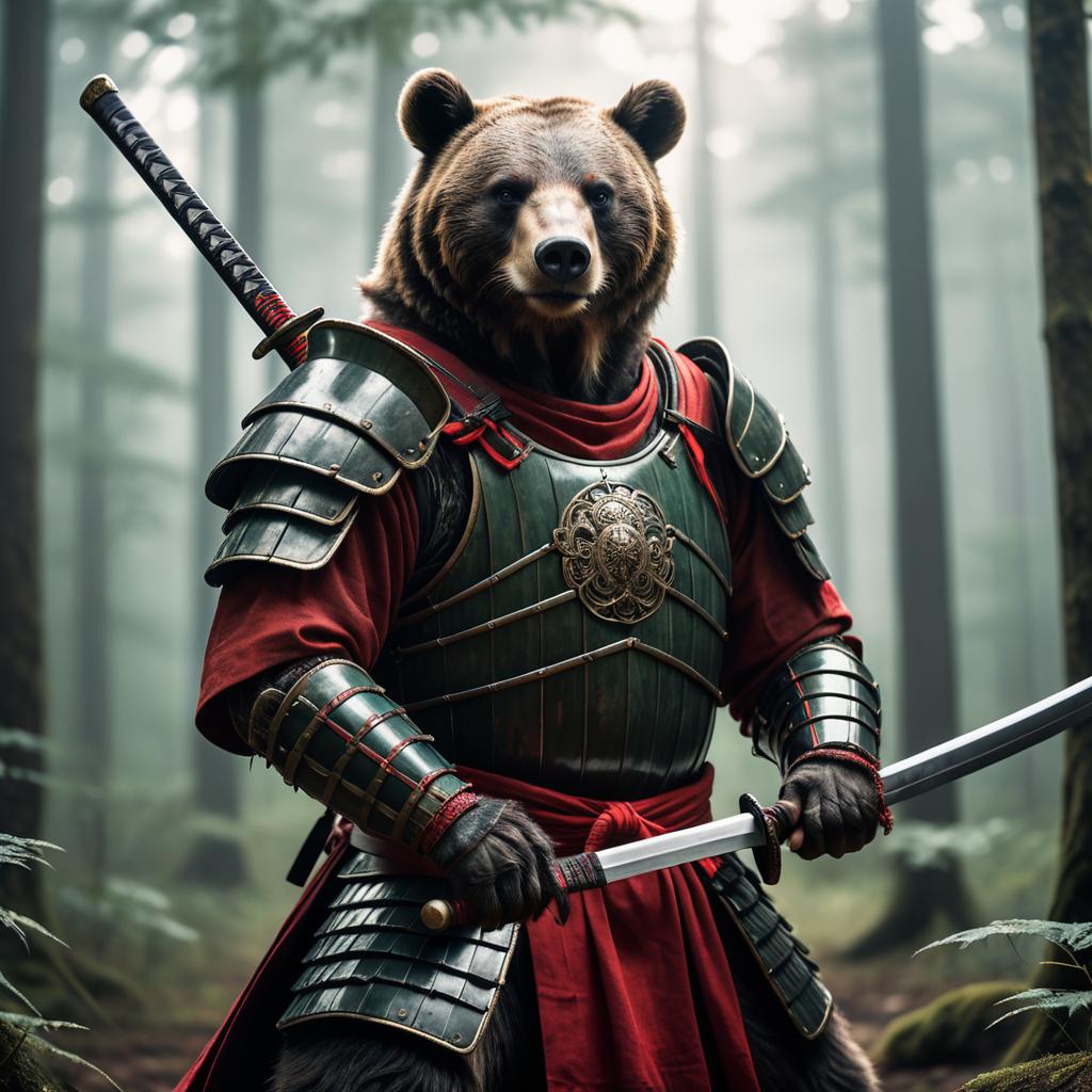 A realistic detailed image of a warrior animal character, a bear or badger-like creature wearing detailed samurai armor made of dark metal and red cloth, holding a long katana sword, standing in a forest clearing with soft natural light and atmospheric background, cinematic lighting, muted natural color scheme with dark green and brown colors