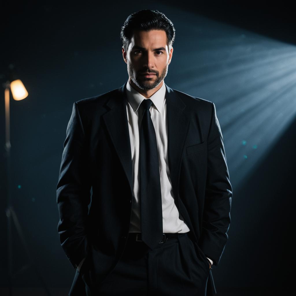 Portrait of a man with short dark hair and a subtle beard shadow wearing a classic dark suit, white shirt, and black tie. The image captures a detective-style look inspired by 1990s iconic attire with studio lighting and a dark background.