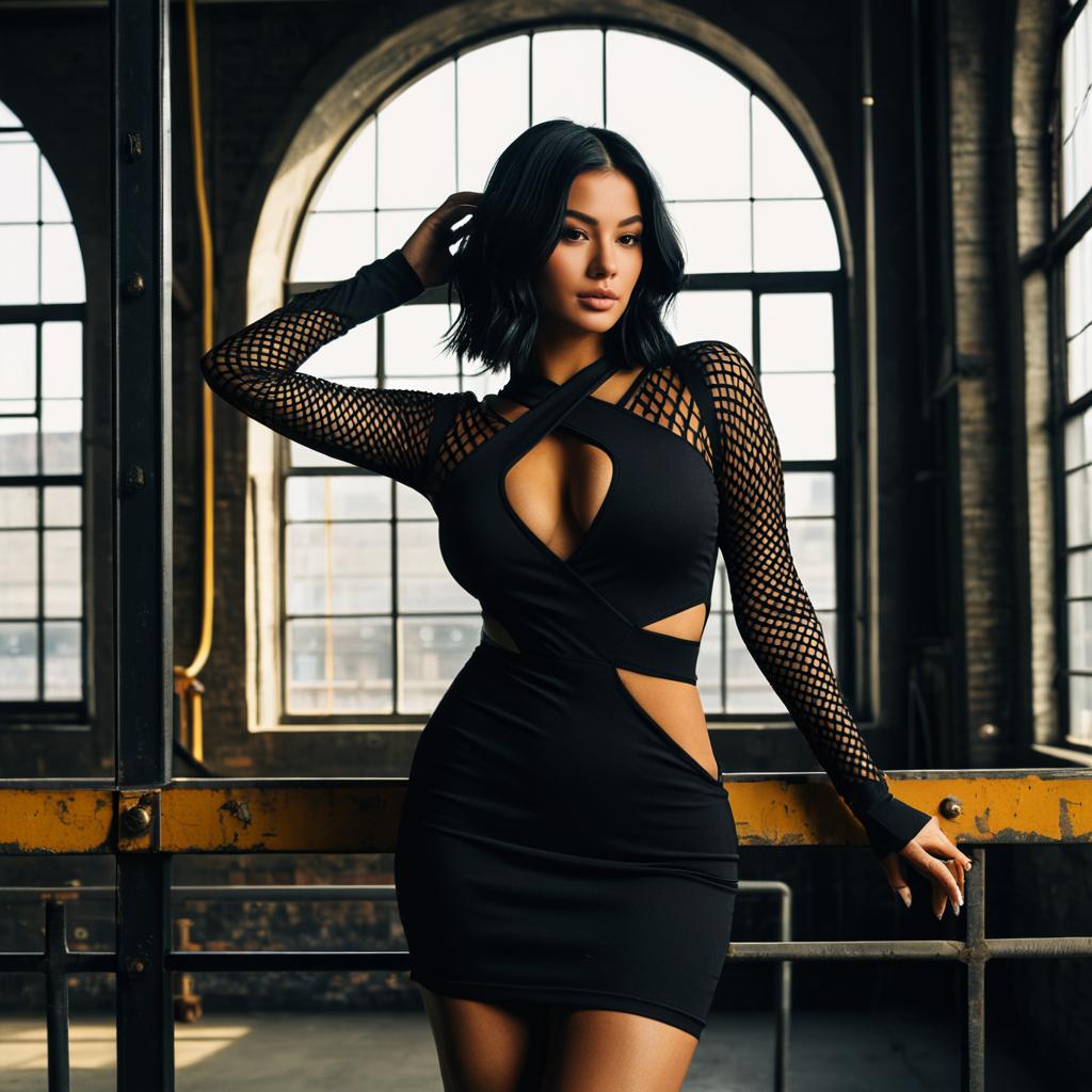Sexy outfit, black cutout mesh long-sleeve bodycon mini dress with crisscross front cutout on olive-skinned woman with sleek shoulder-length black hair posed standing with both arms down, looking over her shoulder, in dark, atmospheric studio with subtle architectural details, dramatic low-key lighting emphasizing contours, fashion editorial photography, full body, high resolution, ultra-detailed