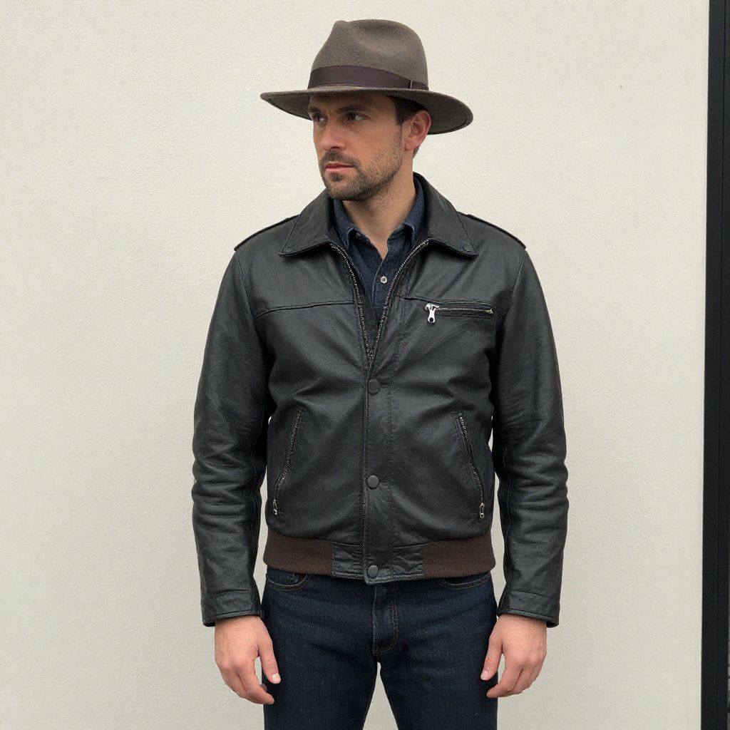 "Vintage Festival Clothing, man in a hat and leather jacket standing in front of a wall"