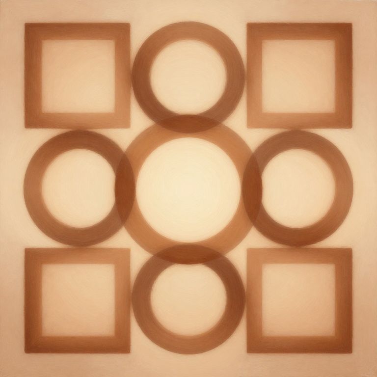 An abstract stable image featuring interlocking rings and squares in balanced formation, painted in warm earth tones with subtle light gradients, minimalist style, emphasizing harmony, calmness, and structural integrity through perfect alignment and spacing.