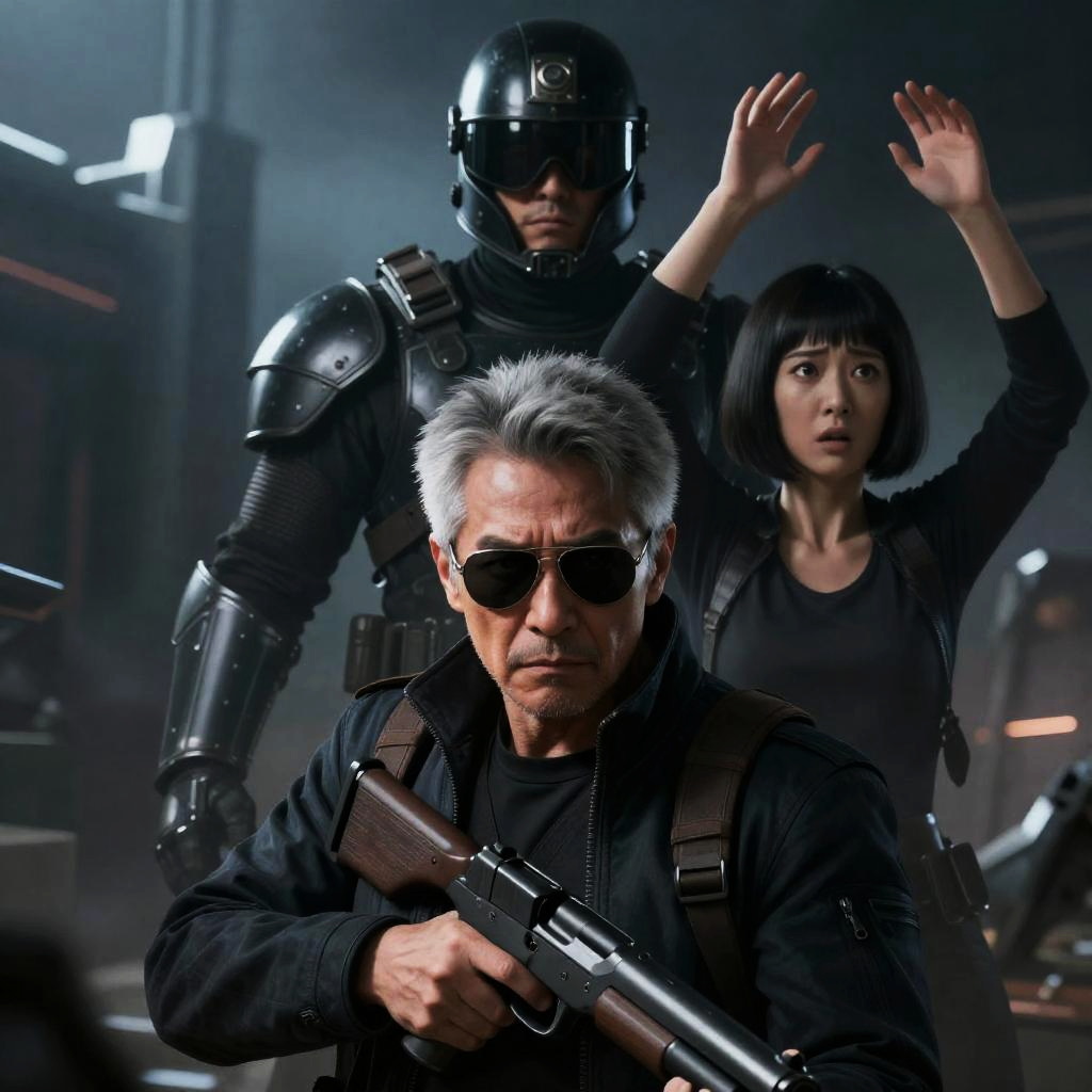 CGI sci-fi scene with three people in black, form-fitting suits standing in front of three towering, green, robotic mechs. Central figure stands front and center, flanked by two people on either side. Large mech with glowing red eye in background. Industrial, futuristic setting with dim, green lighting.