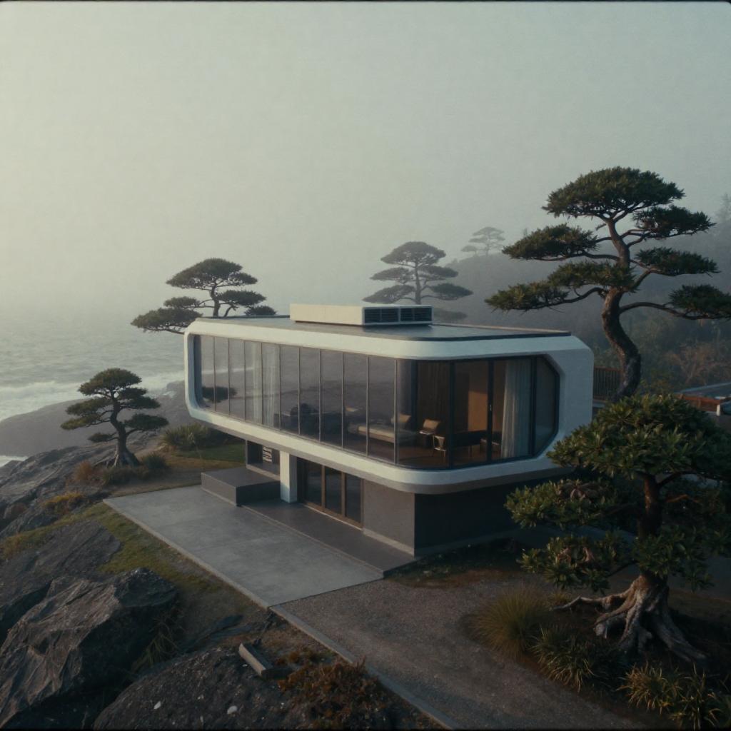 Abstract colors, texture, film grain, skin pores, dusty atmospheric haze, vignetting:0.2 intricate cinematic movie still frame of a beautiful (windblown)1.2 futuristic (solarpunk scifi brutalist ultra-modern architecture technocrat glass tiny house 3d printed house accessory dwelling unit exterior)1.2 on a rocky coastal hillside, (real estate photography drone shot)1.2, (bonsai trees)1.2 landscaping, foggy morning, (analog style)1.3 (film grain)1.3, driveway carport