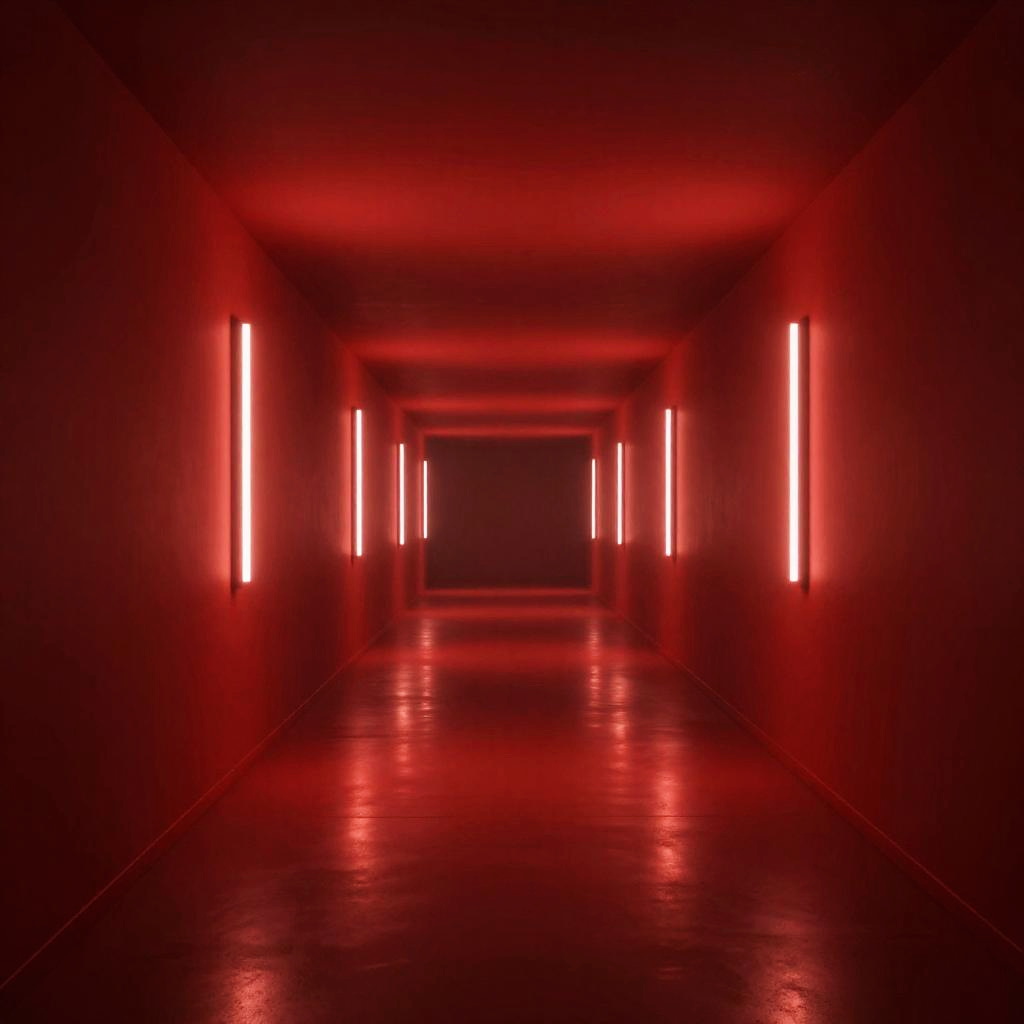 Red liminal space, surreal empty corridor bathed in glowing crimson light, endless passageways with flickering neon signs, eerie atmosphere, minimalistic futuristic design, shadows stretching across glossy floors, subtle mist and ambient red hues
