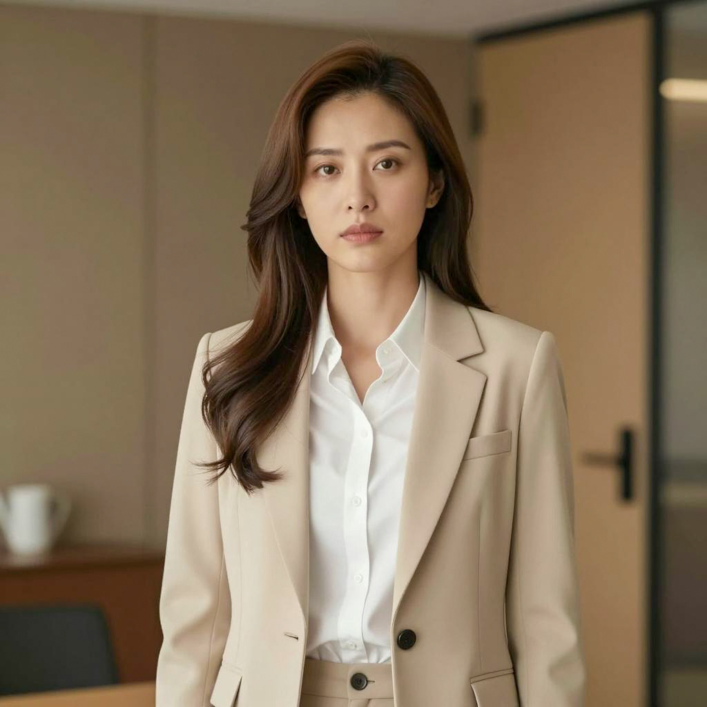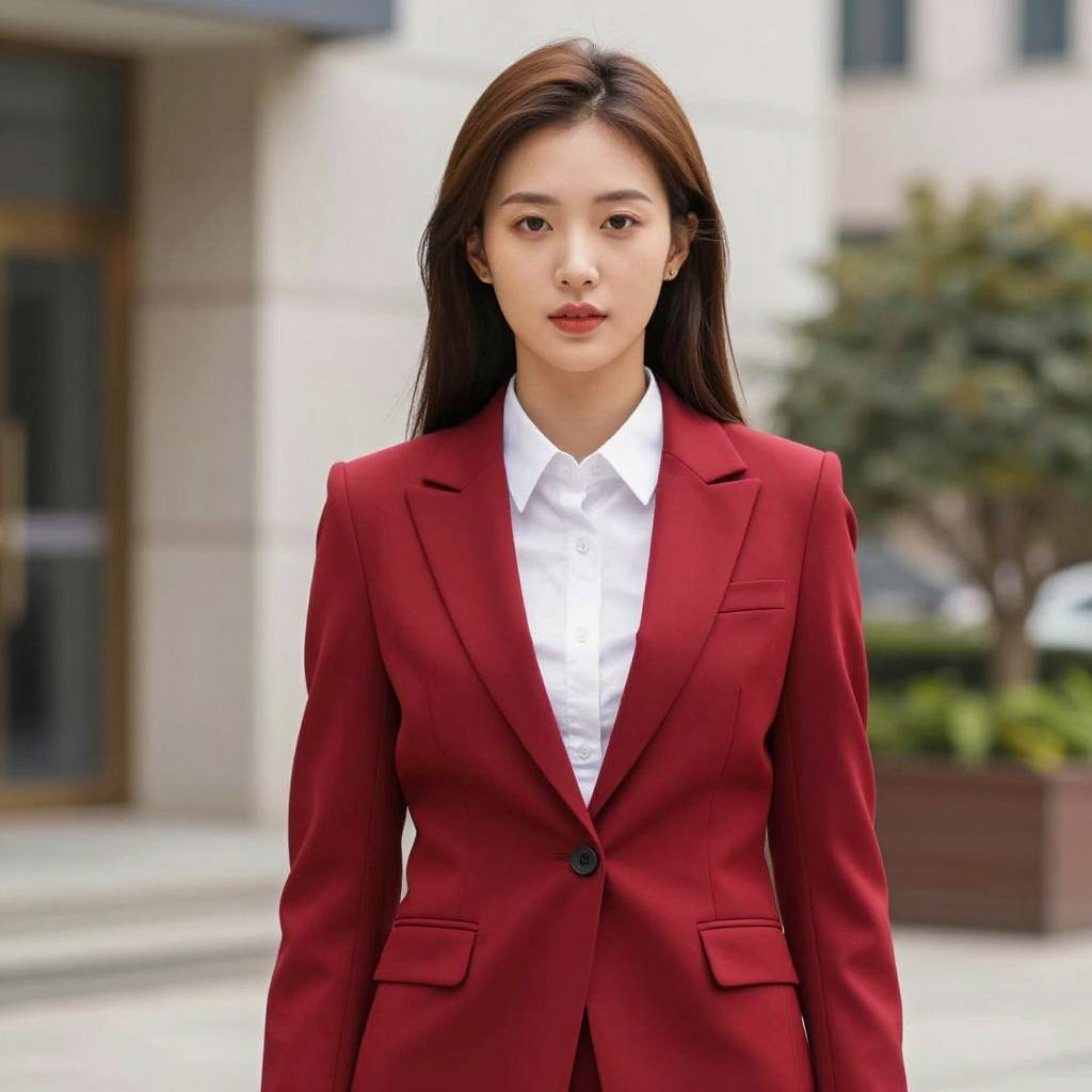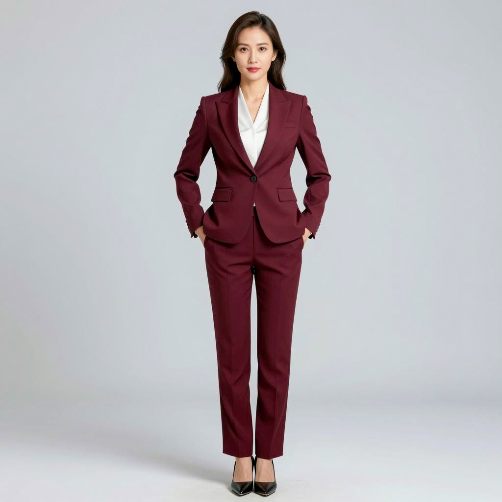 Woman wedding suits costume, photograph of an Asian woman, standing, wearing a maroon business suit, white blouse underneath, hands in pockets, dark hair in a loose updo, neutral expression, light gray background, formal attire, professional look, studio lighting, full body shot