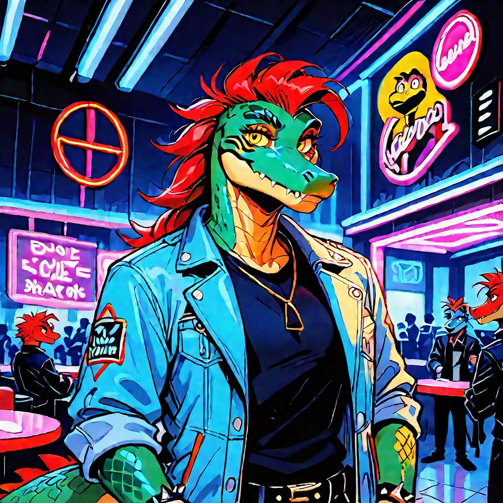 Score_9, score_8_up, score_7_up, score_6_up, score_5_up, score_4_up, rating_safe, source_furry, solo athletic anthro (montgomery gator \(fnaf\):1.25), crocodile, yellow countershading, red hair, spiked bracelet, jewelry, spiked collar, jacket, pants, (neon sign, "WELCOME":1.5), (standing, half-length portrait, three-quarter view, looking at viewer:1.25), , (surrounded, crowd, being watched, large group, public nudity), (nightclub, restaurant, inside
