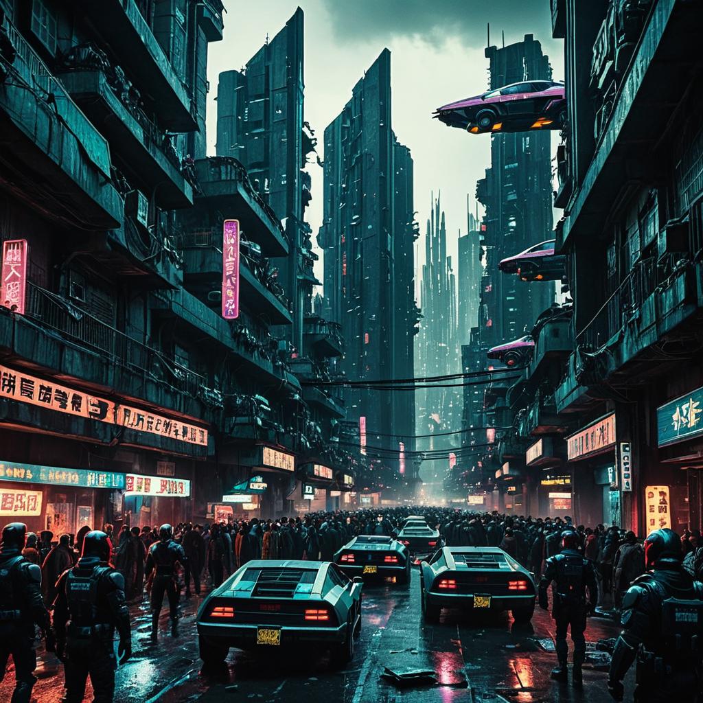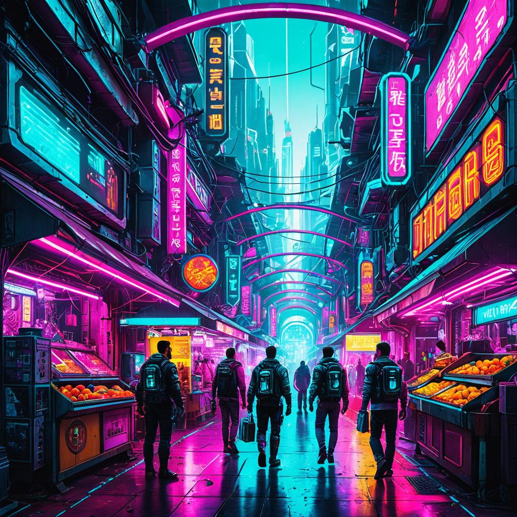 Digital painting of mechanized traders exploring a neon-lit market district, combining science fiction and urban aesthetics, atmospheric lighting with colorful neons and glowing elements, vibrant contrasting hues like bright pinks, cyans, and magentas, centered composition with cyborg vendors and holographic adverts and futuristic architecture in the background