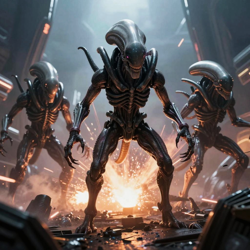Xenomorph Tyranids in a futuristic battlefield, blending the terrifying features of the xenomorph with the swarm instincts of Tyranids, grotesque chitinous exoskeletons covered in alien armor, dynamic action scene with explosive bio-plasma effects and eerie glowing eyes.