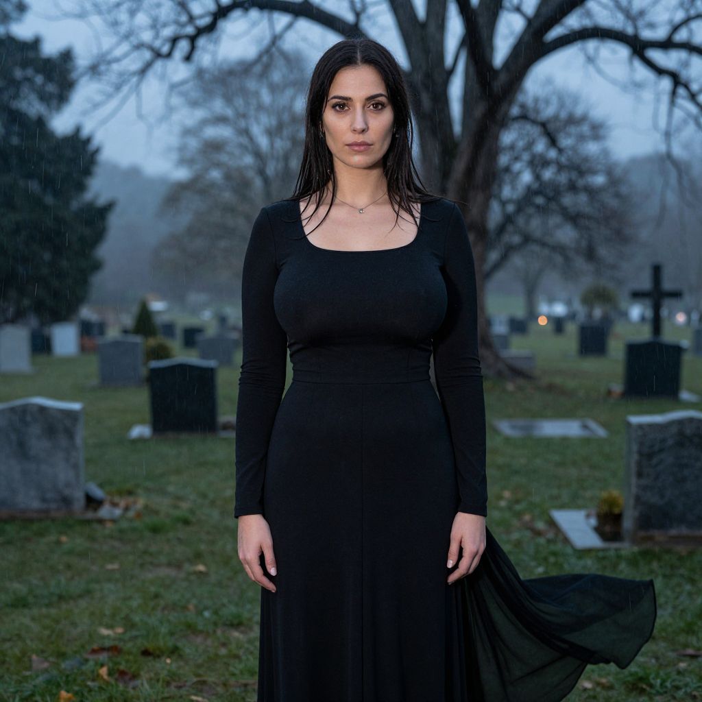 A tall, solemn woman in her late 30s with deep brown eyes and warm, quiet features wearing a sleek black dress funeral costume, standing solemnly in a quiet cemetery at dusk, with falling rain and misty trees in the background, the dress flowing slightly in the breeze, realistic photography style. The woman has big tits and cute face