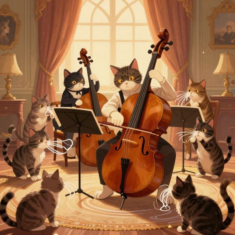 In a whimsical digital illustration reminiscent of a Victorian-era scene, a group of anthropomorphic cats engage in a surreal symphony, playing oversized cello-like instruments while their synchronized movements create visible ripples in the air, which are humorously tasted by other cats scattered around the room, all set against a backdrop of warm golden-hour lighting and ornate decor.