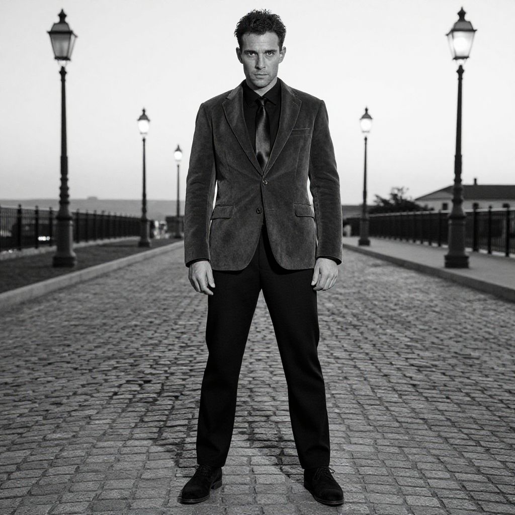 A man, charcoal velvet blazer, black dress shirt with bib front, black silk tie, black dress pants, suede black oxford shoes, cobblestone pavement, old-fashioned lampposts, soft glow of evening lights, Ilford film stock, confident expression Man has masculine face and piercing eyes