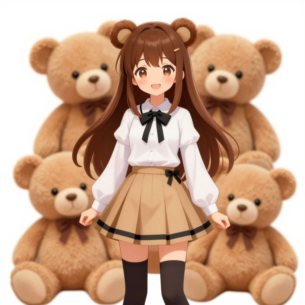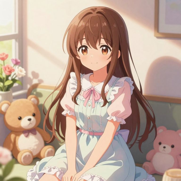 Imouto, a young anime-style girl with big expressive eyes and a gentle smile, wearing a cute pastel-colored dress, sitting in a sunlit room with soft shadows, surrounded by plush toys and delicate flowers, detailed and vibrant illustration.