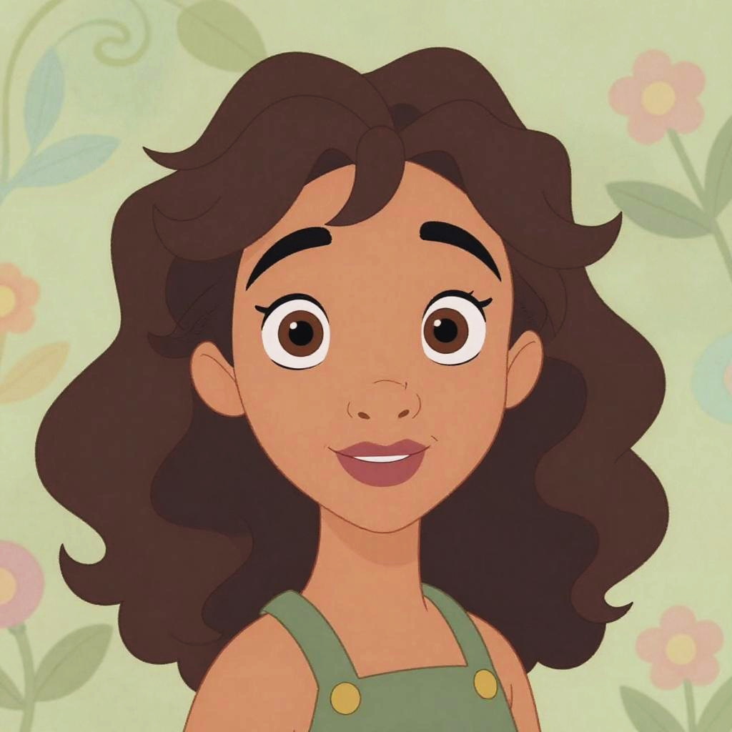 Digital cartoon of a young girl with dark wavy hair, brown eyes, and green overalls, smiling against a pastel floral background.