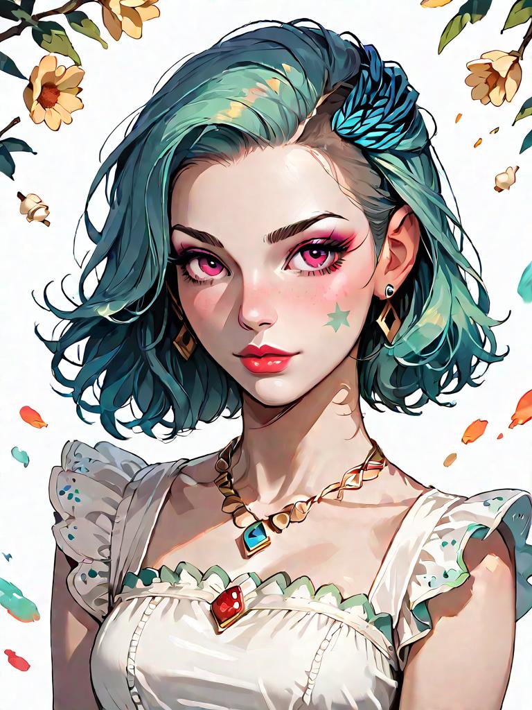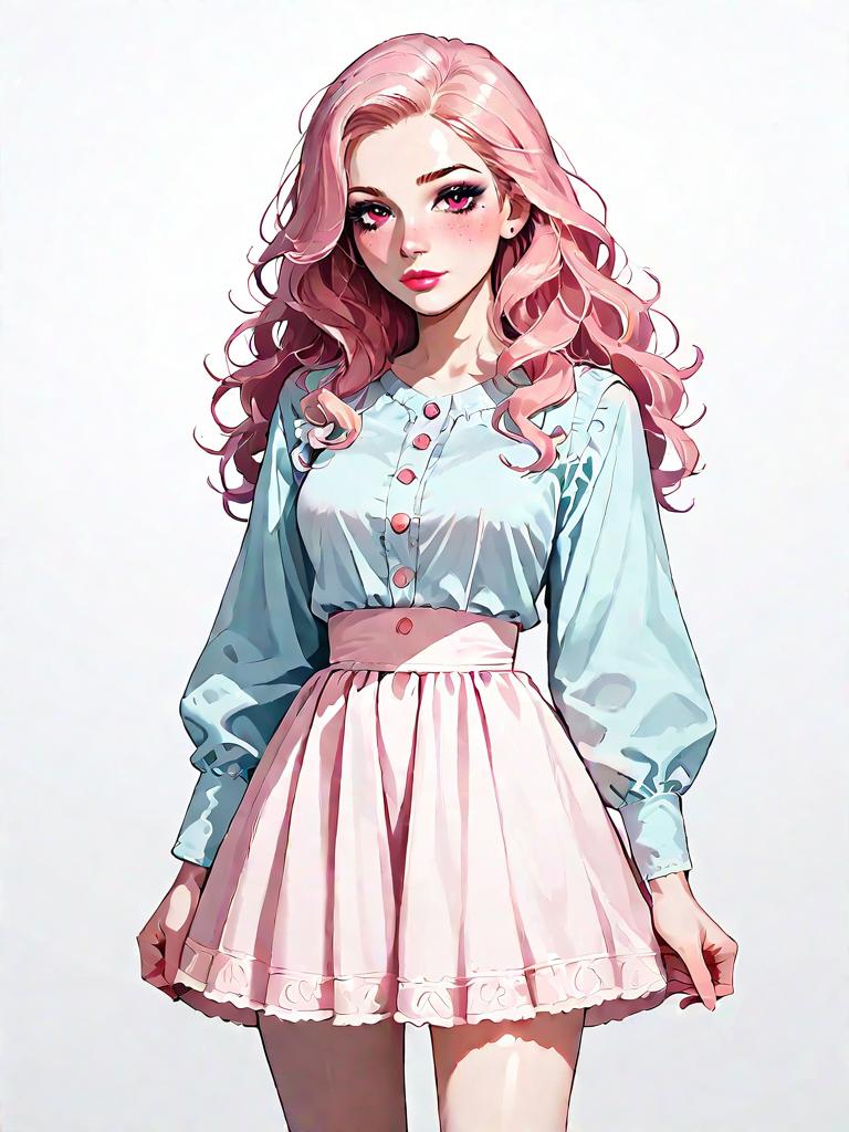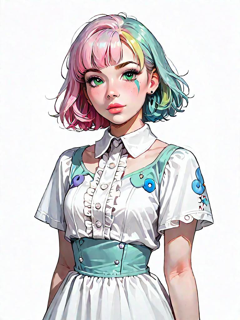 1girl, source_comics, realistic face, full body shot, Woman, whimsical kawaii, short-sleeved skater dress in pastel colors, sheer overlay with scattered inkblot pattern, contrasting peter pan collar and trim in mint green, decorative pockets at the waist, white buttons, ruffled hemline, soft makeup with pastel eyeshadow, straight pastel-colored hair with blunt bangs, white background.