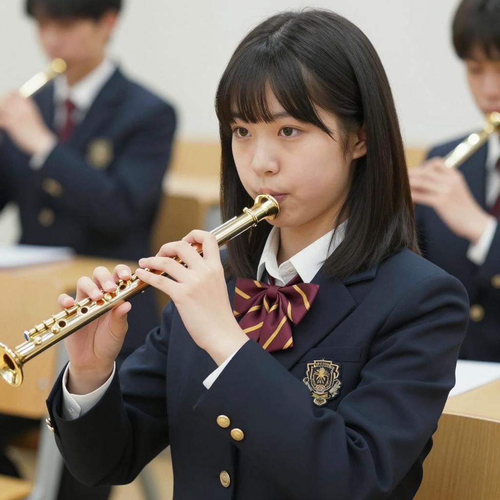 Middle-aged man with glasses, dark suit, white shirt, and tie stands center, speaking. "Good Luck Class of 1965" banner above. Musicians and students in white shirts and dark vests or dresses stand and sit around him. Drum, flute, and other instruments visible. Dark curtain background. 11 people in total. Man's expression neutral. Students' expressions neutral or focused.