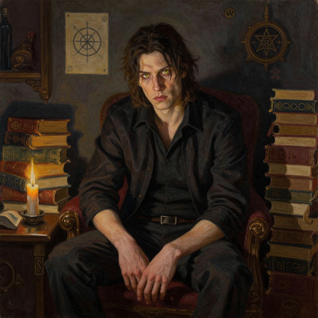I saw a man with yellow eyes sitting alone in a dimly lit room filled with old books and occult symbols, his expression enigmatic and intense, candles casting flickering shadows, gothic atmosphere, realistic painting style.